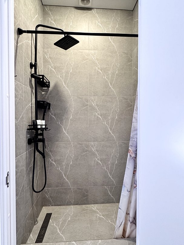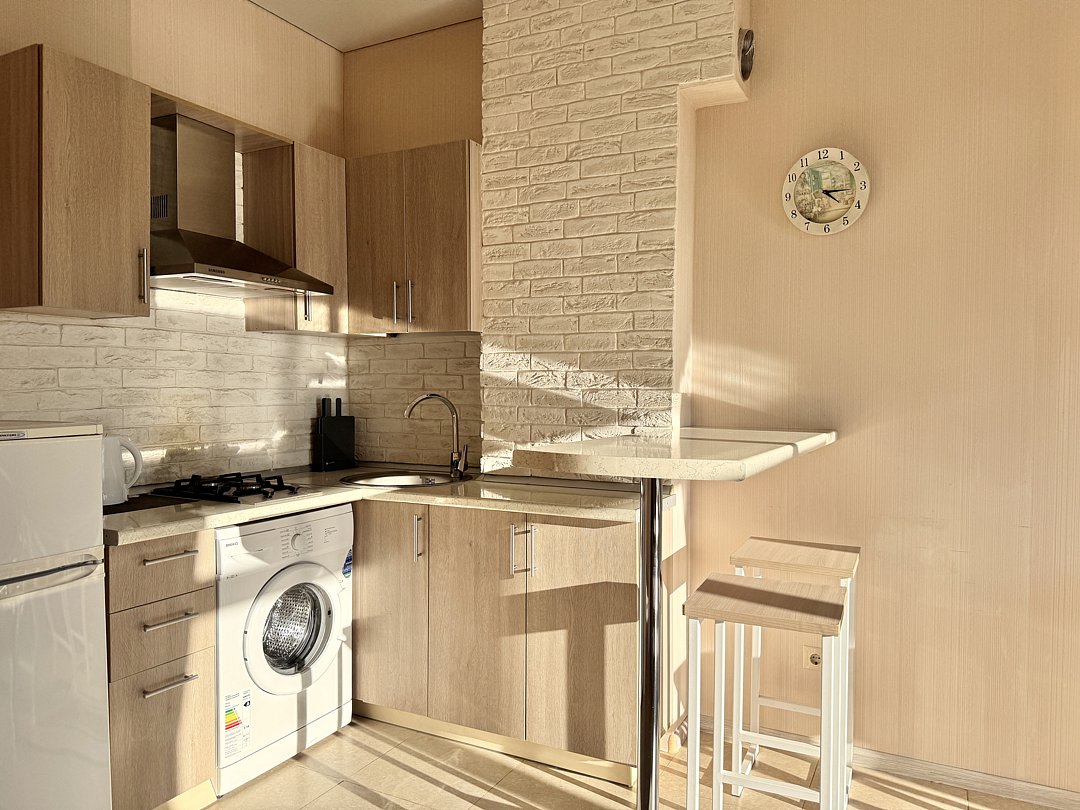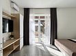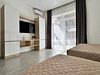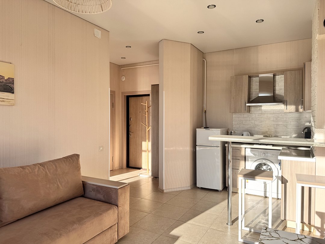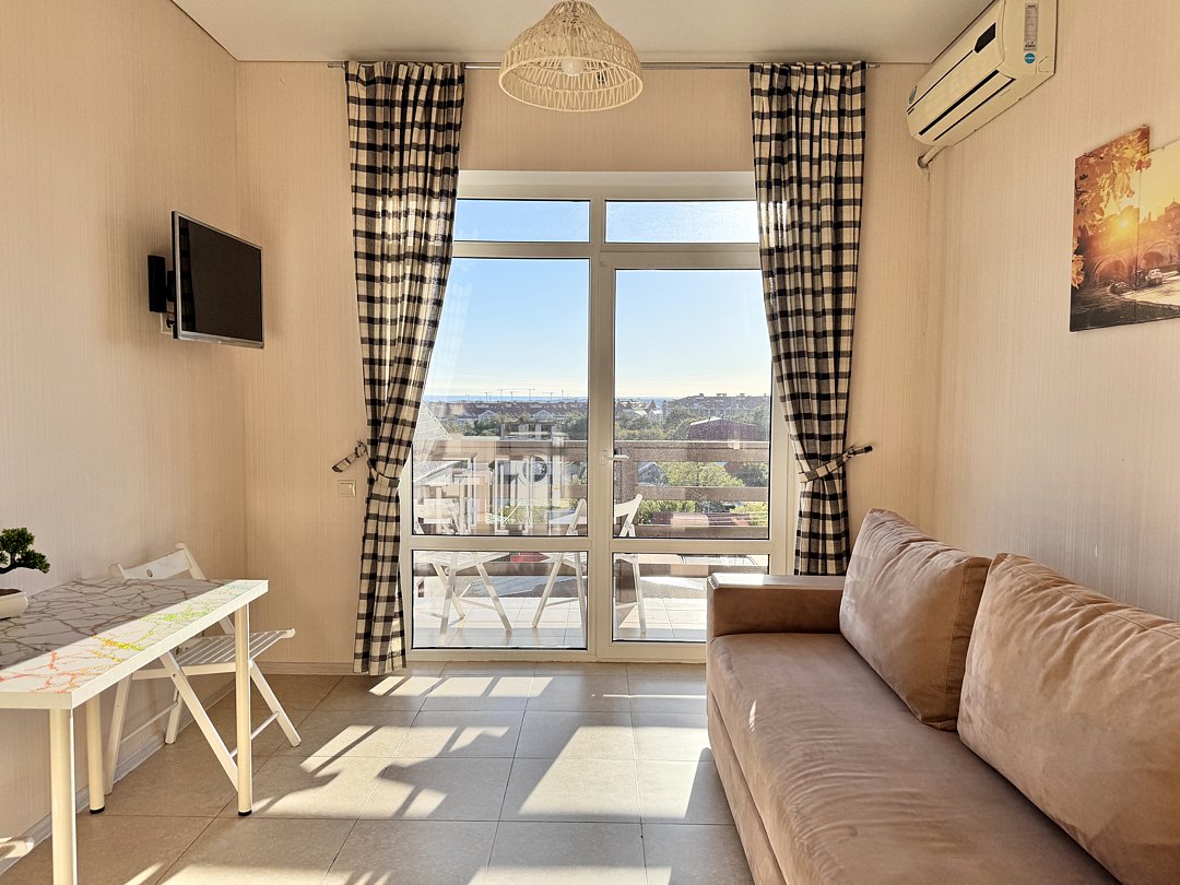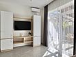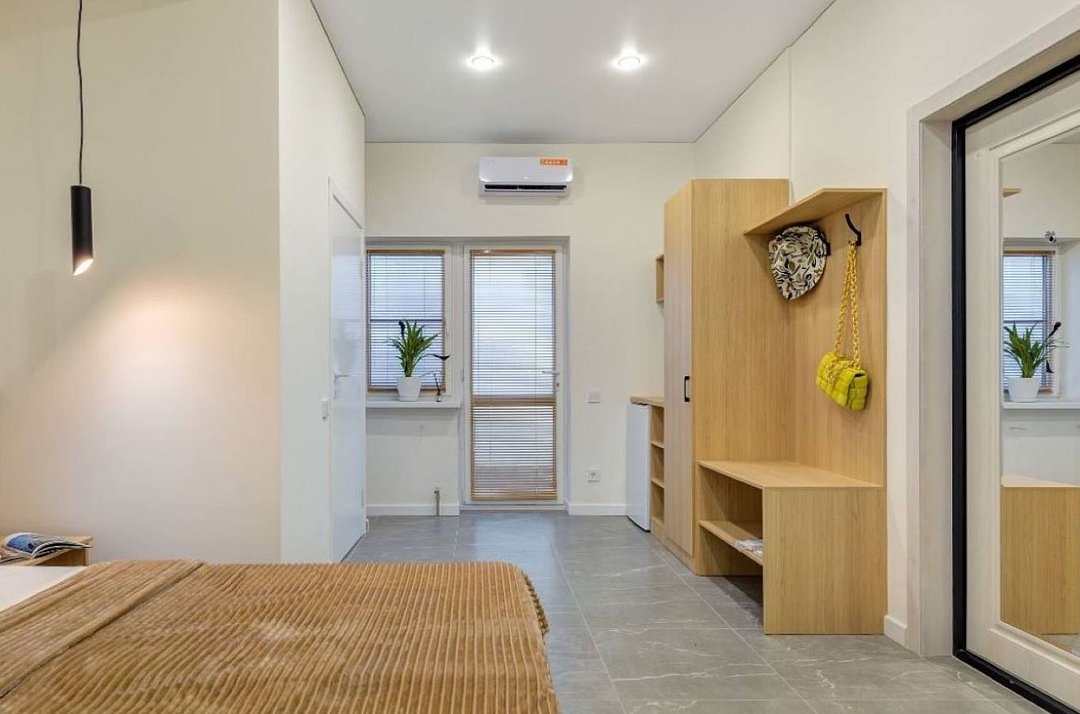 Просторная студия с зоной отдыха возле номера. Кухонный уголок: одноконфорочная индукционная плита, холодильник с морозильной камерой, мойка, посуда для приготовления пищи (кастрюли, сковорода, кухонные принадлежности), посуда для приема пищи (тарелки, кружки, стаканы, столовые приборы); барная стойка, стулья; стиральная машина. Спальная зона: двуспальная кровать, односпальная кровать; шкаф, вешалка, телевизор, кондиционер; шторы блэк-аут. Раздельный санузел. Душ, комплект полотенец, тапочки, набор гостиничной косметики. Также возможно размещение доп места в виде евро-раскладушки.