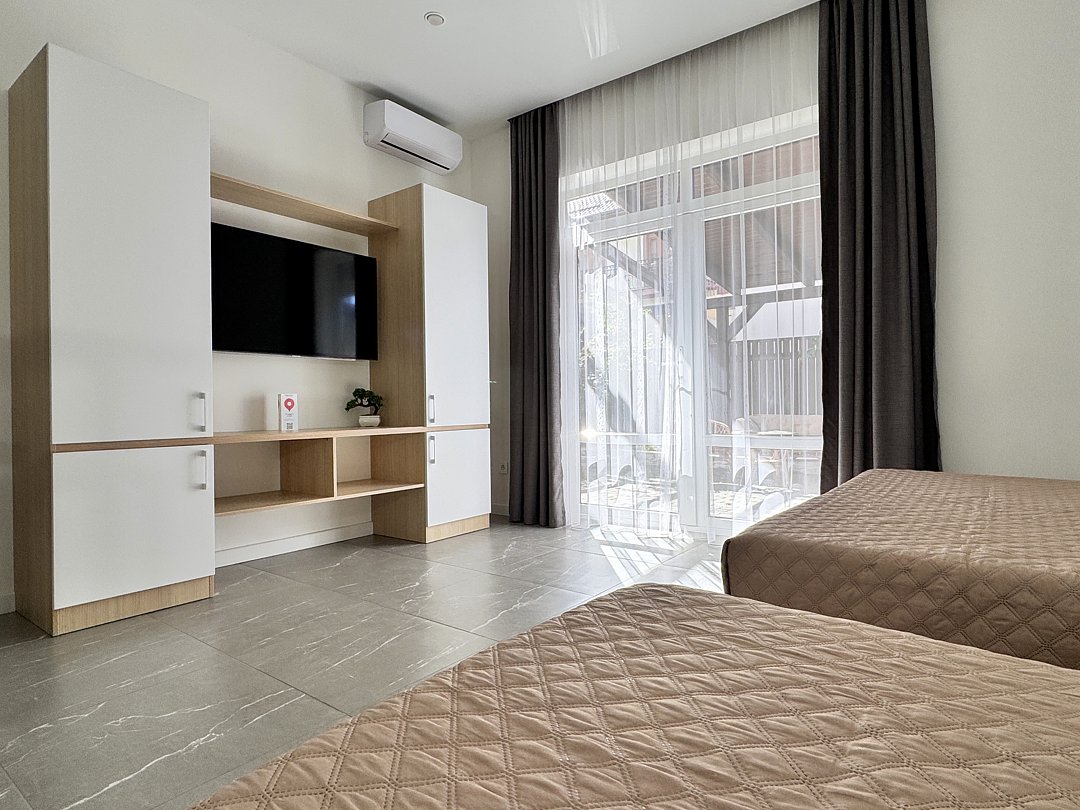 Уютный номер на первом этаже с зоной отдыха возле номера. В номере имеется двуспальная кровать, прикроватный тумбочки, прикроватные светильники, кресло-кровать, шкаф, вешалка, зеркало, электрический чайник, мини-холодильник, телевизор, кондиционер. Ванная комната: душ, зеркало, фен, комплект полотенец, тапочки, набор гостиничной косметики. Зона отдыха возле номера.