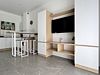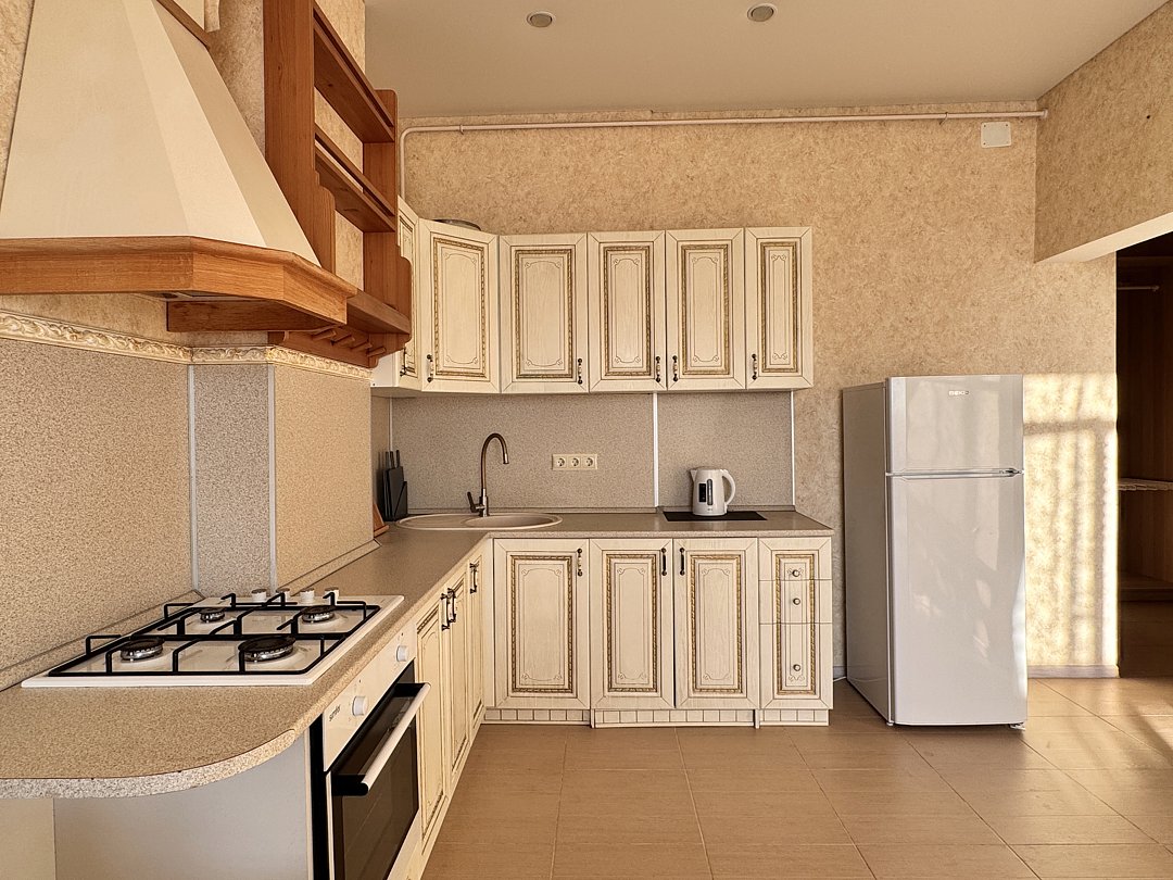 Кухня-гостиная: диван-кровать, обеденная группа (стол, стулья), телевизор, кондиционер; кухонный гарнитур с газовой плитой, вытяжка, электрический чайник, холодильник с морозильной камерой, посуда для приготовления пищи (кастрюли, сковорода, кухонные приборы), посуда для приема пищи (тарелки, кружки, столовые приборы); стиральная машина, сушилка для белья, выход на балкон.