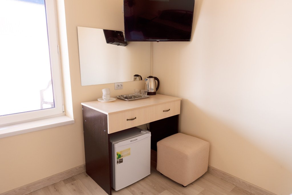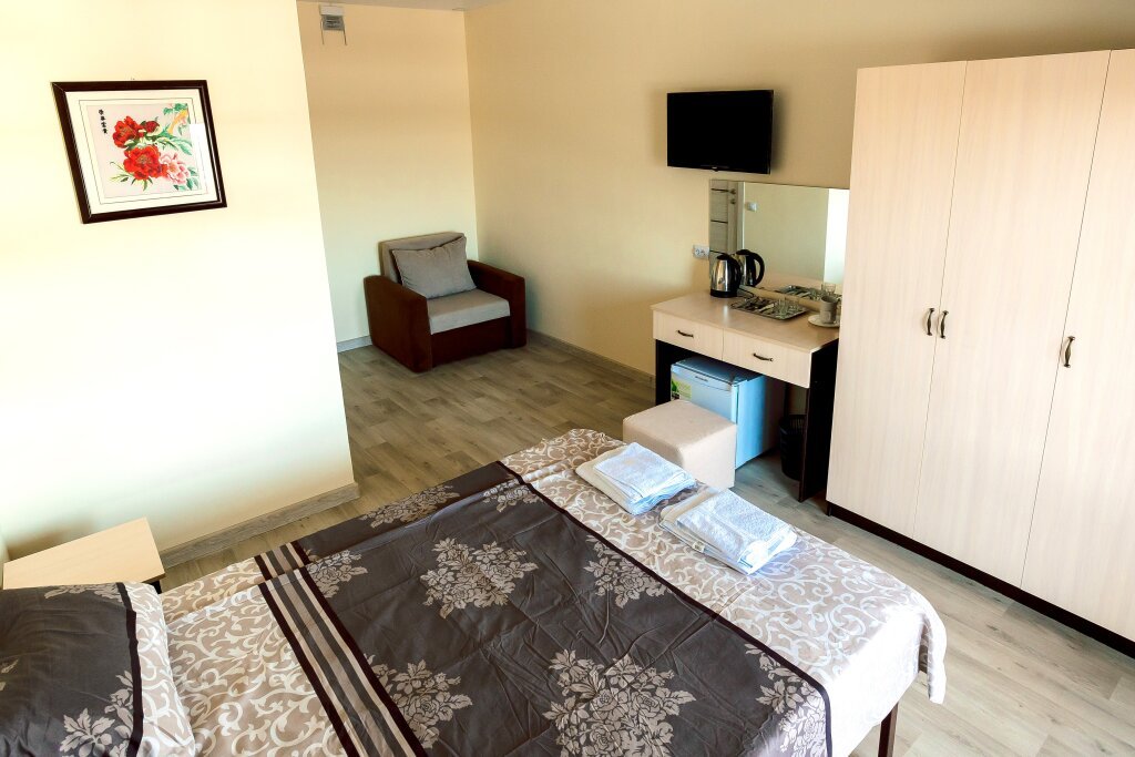 Номер уютно обставлен и оснащён необходимым, чтобы отдохнуть после долгого и насыщенного дня. Имеются телевизор. Оснащение зависит от выбранной категории номера.