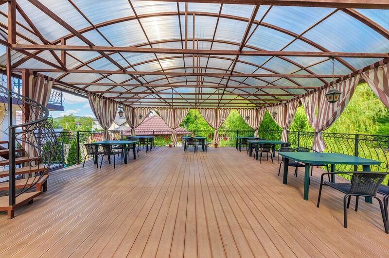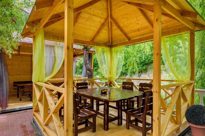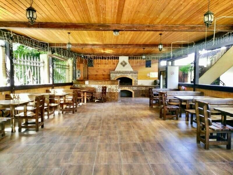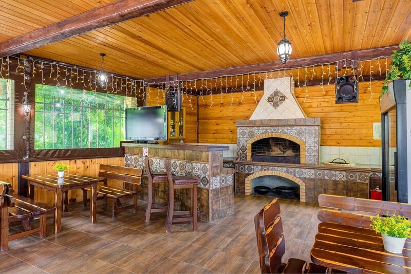 На территории работает кафе, есть зона для барбекю с мангалами. К услугам отдыхающих уличный бассейн с шезлонгами рядом, после насыщенного дня гости могут расслабиться в русской бане. Также всем доступны услуги прачечной и беспроводной интернет, а для детей организована игровая площадка с батутом.