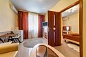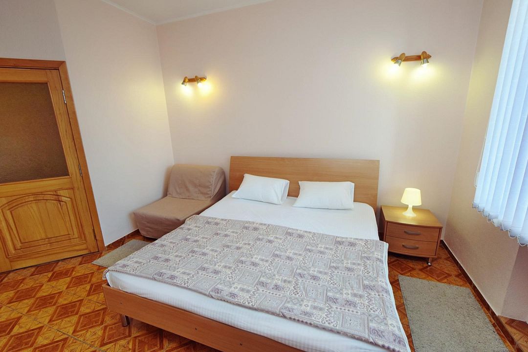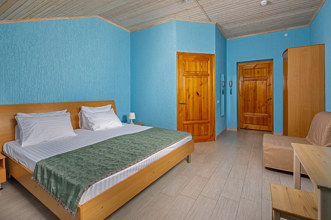 Современный однокомнатный номер подойдет для четырехместного размещения. Здесь будет комфортно как семейной паре с детьми, так и другим вариантам гостей. В номере большая двуспальная кровать king-size шириной 2 метра и два удобных кресла-кровати. Площадь номеров этой категории 24 кв.м. Удобные кровати с ортопедическими матрацами позволят вам комфортно выспаться, а как говорится хороший сон – залог успеха. В каждом номере система кондиционирования; ванная комната с душем и туалетом; цифровое ТВ, доступ к интернету, холодильник, набор полотенец и мыльных принадлежностей.Услуги и удобства