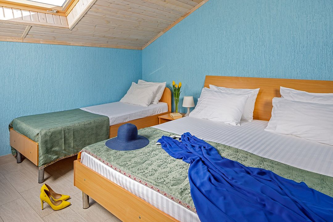 Мансардные номера пользуются все большей популярностью. У многих номер ассоциируется с верхним этажом, но современные методы строительства и внутреннего оснащения позволяют использовать апартаменты с мансардой создавая уникальное чувство уюта. Номер оснащен всеми удобствами для комфортного отдыха как семейной паре так и более численной группе гостей. В номере большая ванная комната с душем и туалетом, холодильник, система кондиционирования, LCD телевизор с цифровыми каналами и usb плеером, двуспальная кровать размера king-size, односпальная кровать и кресло-кровать. Комплект полотенец и мыльные принадлежности на каждого гостя находятся в ванной комнате.Услуги и удобства