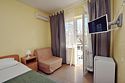 Современный однокомнатный номер с балконом и потрясающим видом на море и горы , подойдет для одно-, двух- или трехместного размещения. Здесь будет комфортно как семейной паре с ребенком, так и гостям посетившим город по рабочим делам. Площадь номеров этой категории 18 кв.м. Удобные кровати с ортопедическими матрацами позволят вам комфортно выспаться, а как говорится хороший сон – залог успеха. В каждом номере система кондиционирования; ванная комната с душем и туалетом; цифровое ТВ, доступ к интернету, холодильник, набор полотенец и мыльных принадлежностей.Услуги и удобства