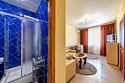 Двухкомнатный люкс разделен на гостиную и спальную зоны. В каждой комнате выход на балкон. Уютный номер для размещения одного, двух , трех или четырех человек. Площадь номера – 35 кв.м. В спальной зоне одна большая кровать, прикроватные тумбы, журнальный стол, шкаф, кондиционер и телевизор.В гостиной – раскладной диван, письменный стол, журнальный стол, телевизор, микроволновая печь, чайник, столовые принадлежности, холодильник и кондиционер. В ванной комнате: современная душевая кабина и туалет, бесплатные гигиенические принадлежности: мыло, гель для душа, шампунь и комплект полотенец.Услуги и удобства
