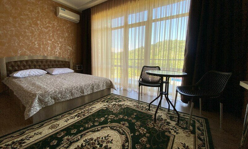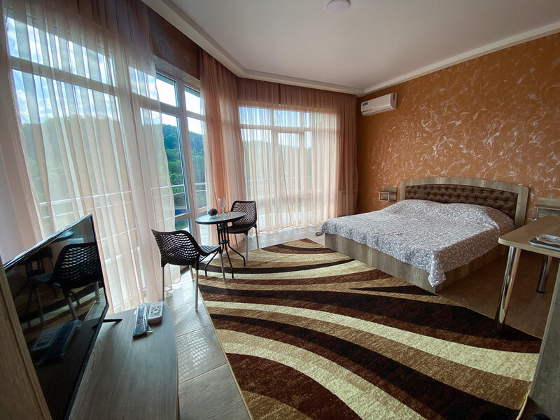 спутниковое телевидение, Wi-Fi, холодильник, кондиционер, фен, ванная комната, ванна, банные полотенца, пляжные полотенца, тапочки, гигиенические средства, балкон, двуспальная кровать, стулья, вешалки, зеркало, душ, вид во двор, стол, телевизор с плоским экраном, шкаф-купе, вид на горы, без питомцевВ гостиничном номере