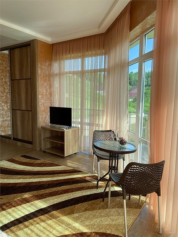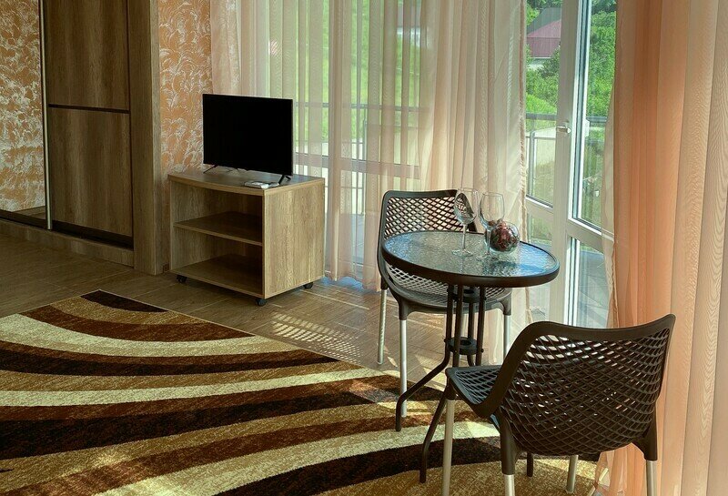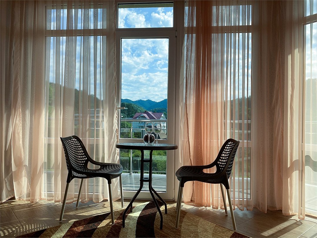 спутниковое телевидение, Wi-Fi, холодильник, кондиционер, фен, ванная комната, ванна, банные полотенца, тапочки, гигиенические средства, балкон, двуспальная кровать, стулья, вешалки, зеркало, раковина, душ, вид во двор, стол, туалет, телевизор с плоским экраном, шкаф-купе, вид на горы, вид на лес, без питомцевВ гостиничном номере