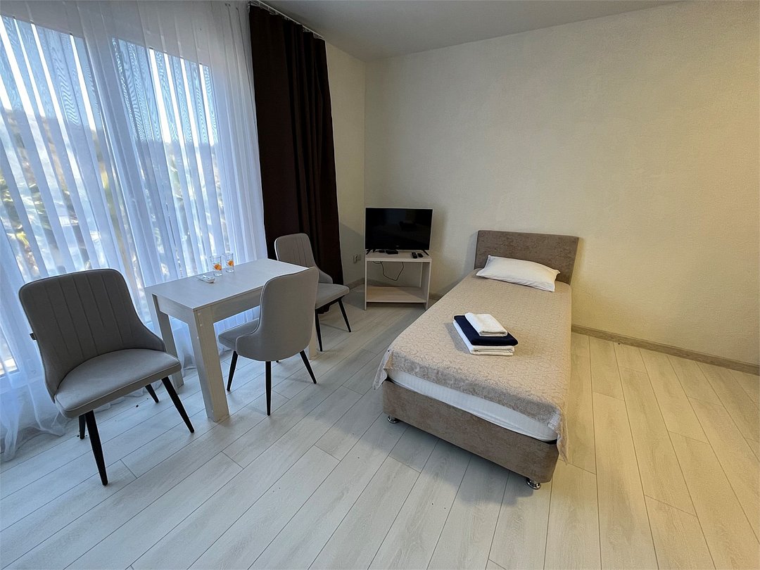 В трехместном номере без балкона с комфортом разместятся три взрослых или два взрослых и один ребенок. Есть возможность установить дополнительное спальное место. В номере есть все для Вашего удобства: комфортные спальные места, кондиционер, телевизор, шкаф, небольшой обеденный стол и стулья, собственная ванная комната с феном и туалетными принадлежностями.Услуги и удобства