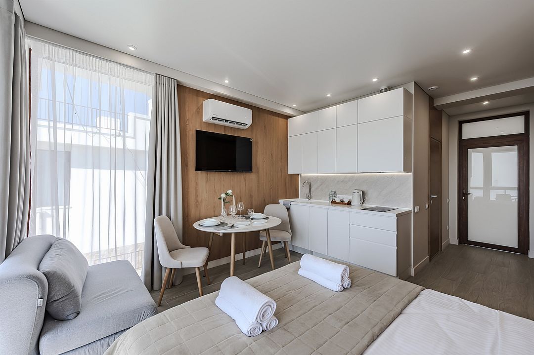 В каждом номере отеля предусмотрен набор мягкой и кухонной мебели, пространство для хранения вещей, кондиционер, телевизор, холодильник, плита электрическая, стиральная машина, чайная станция, набор посуды, сейф. Все номера со своим санузлом, душем, феном, халатами, тапочками.