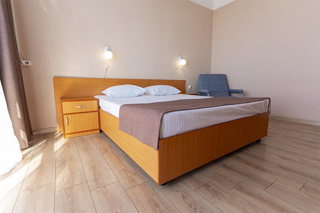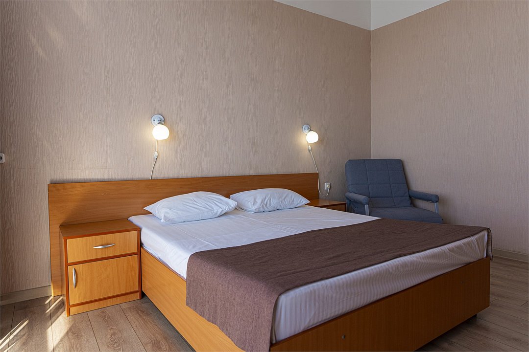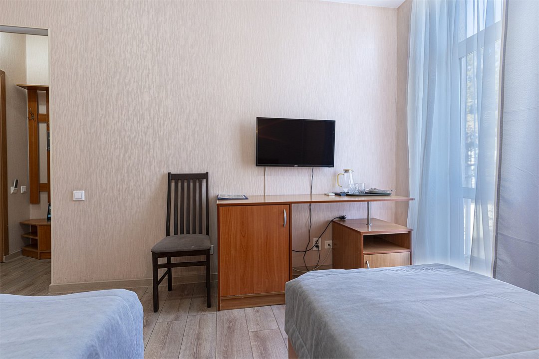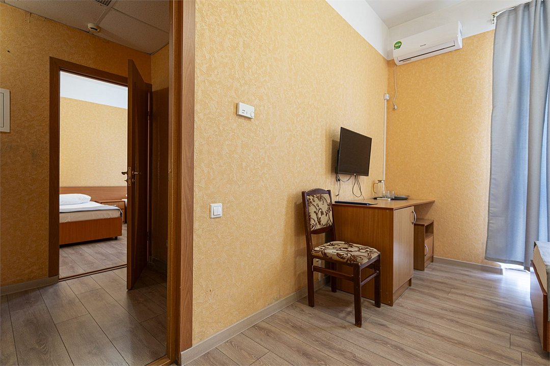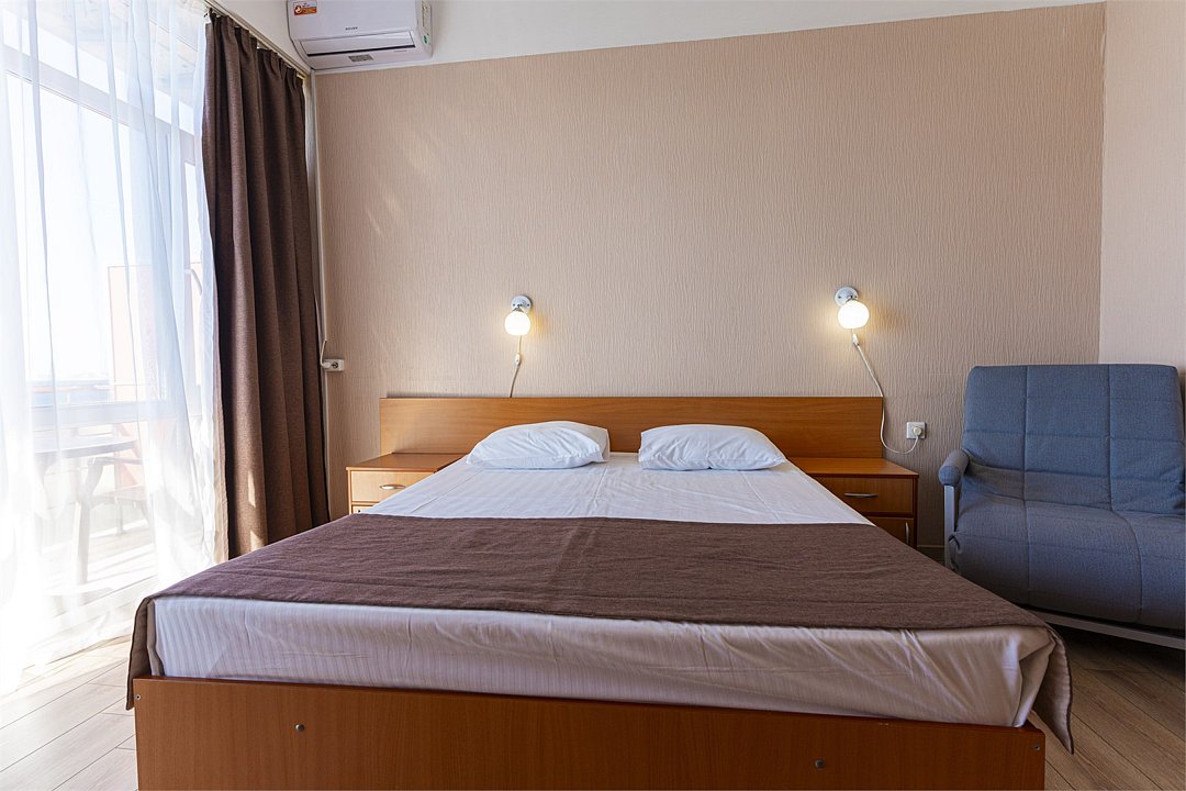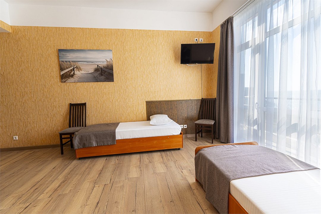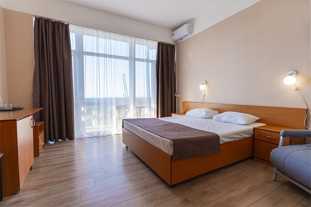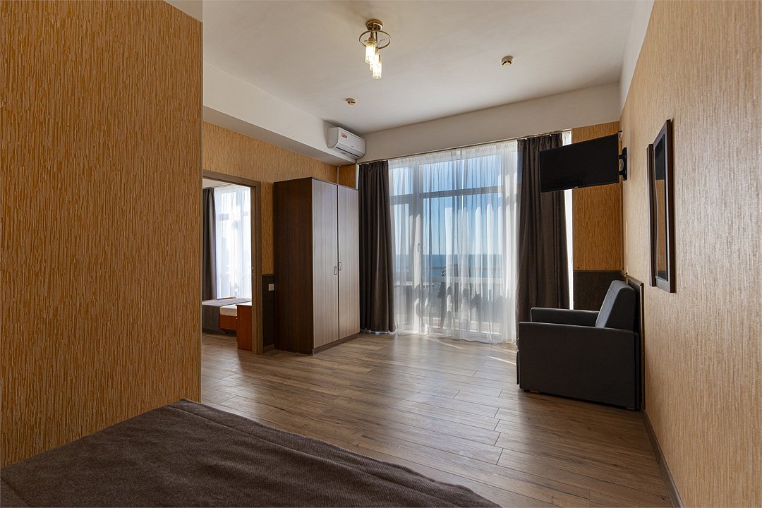 Просторный двухкомнатный номер с видом на море. Двухспальная кровать и две односпальные кровати с возможностью установки дополнительного места.Услуги и удобства