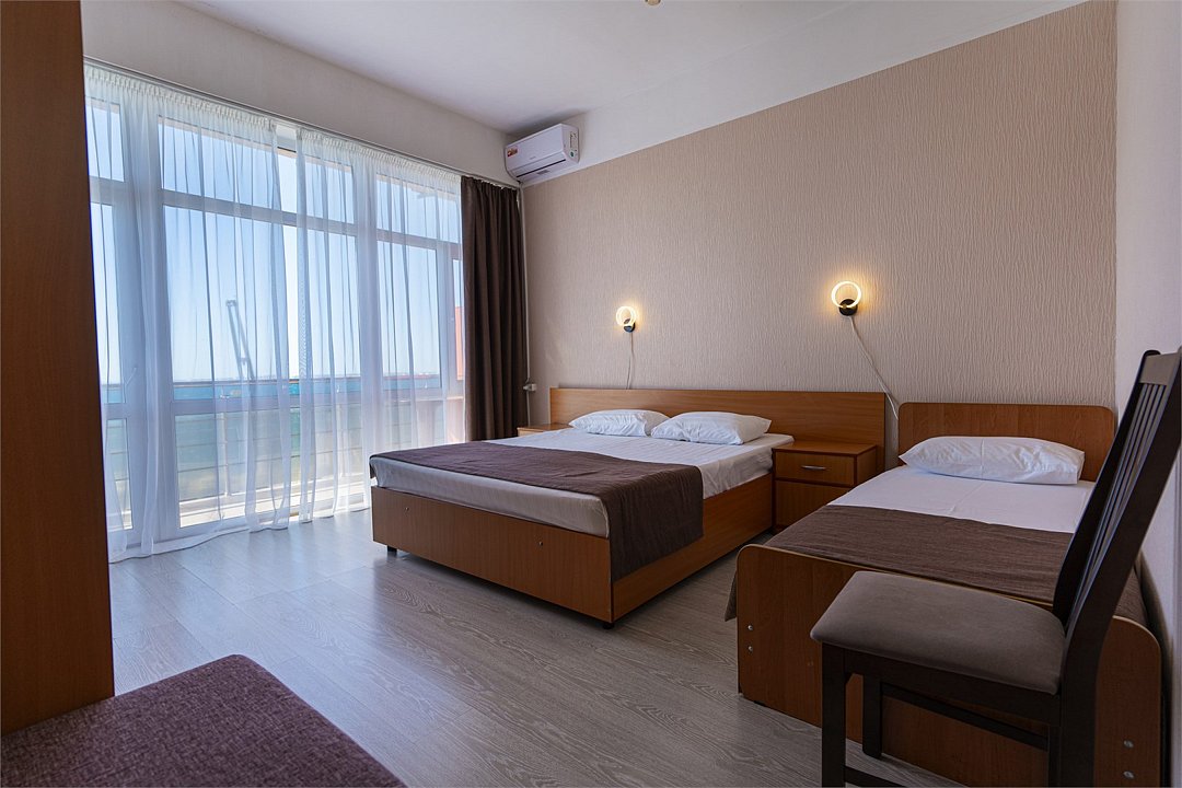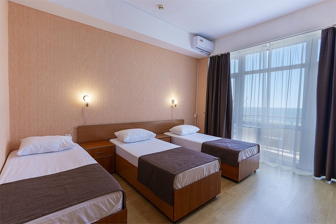 Трехместный номер с видом на море. Двухспальная кровать и односпальная кровать с возможностью установки дополнительного места.Услуги и удобства
