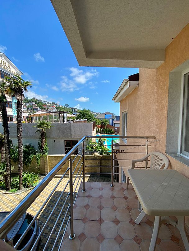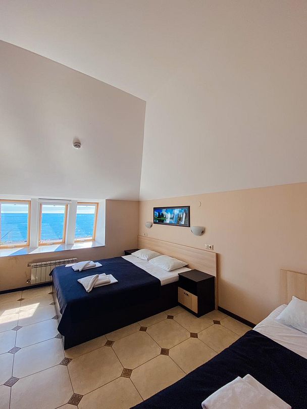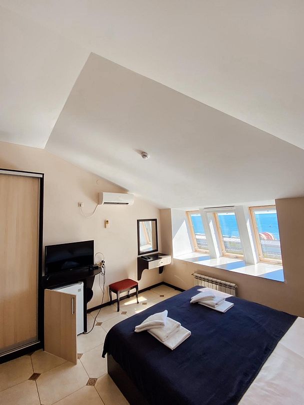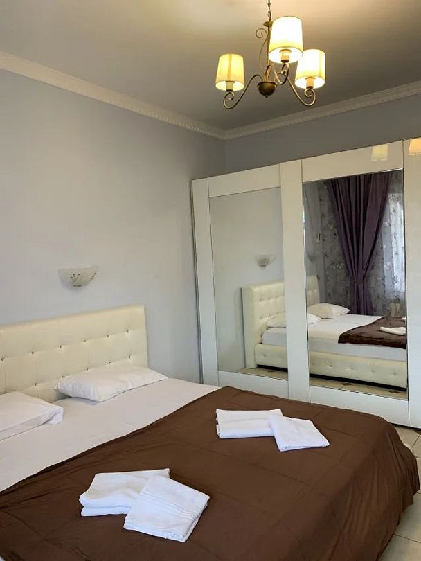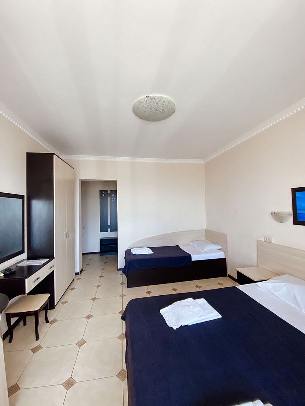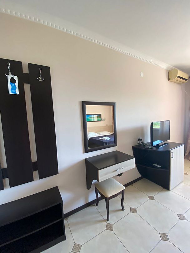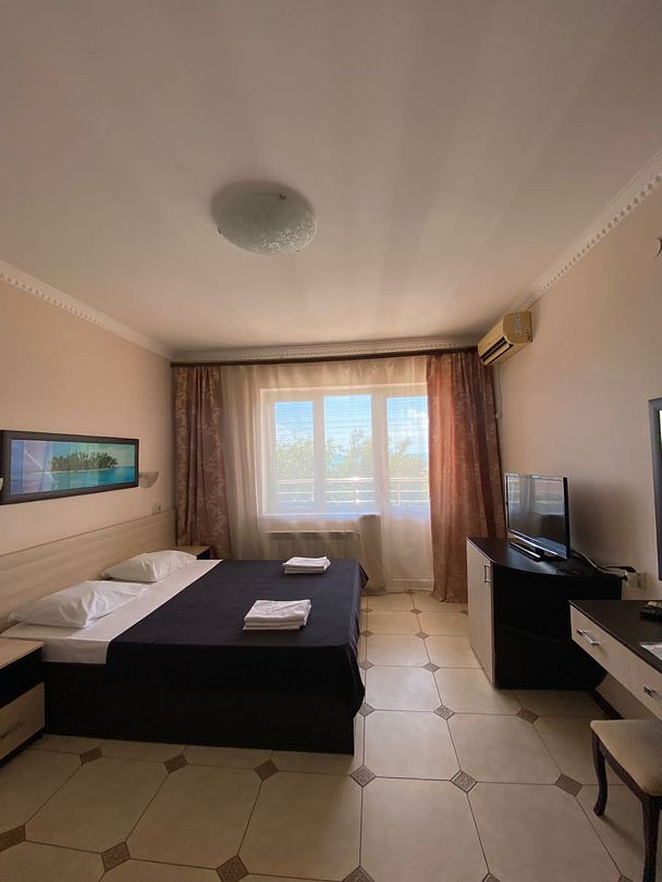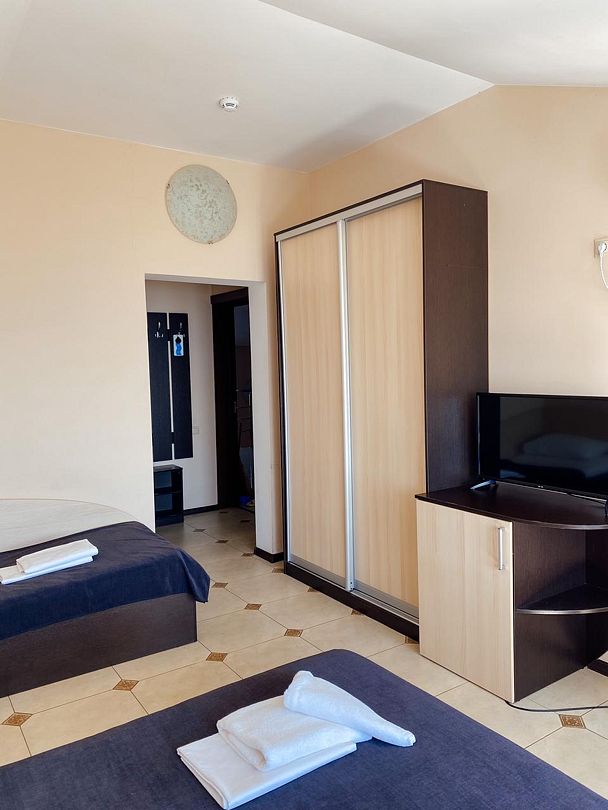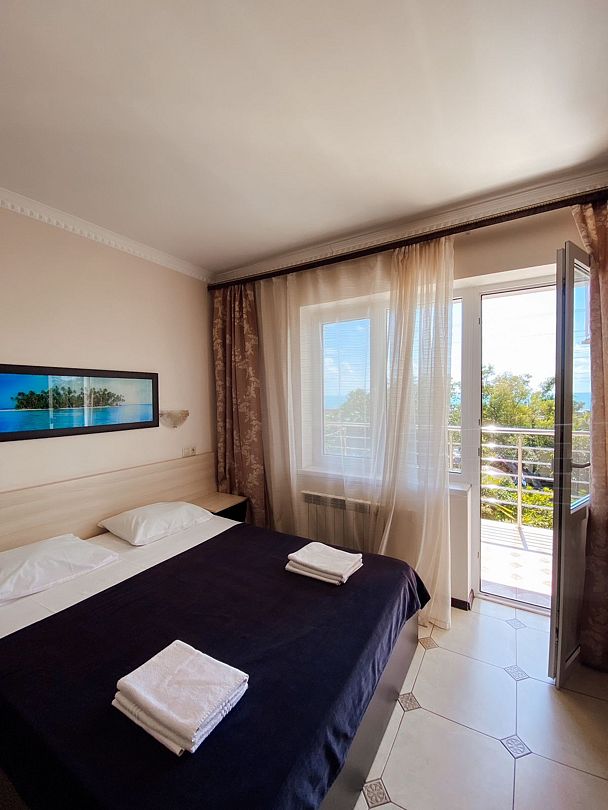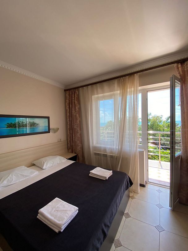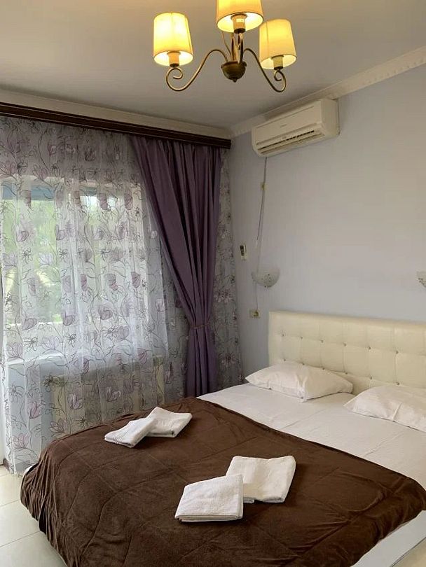 Гостевой дом занимает благоустроенную озелененную территорию всего в 150 метрах от берега моря. В распоряжении отдыхающих двух-, трех- и четырехместные номера со светлыми, современными интерьерами, везде установлена сплит-система, есть индивидуальный санузел, холодильник, телевизор.
