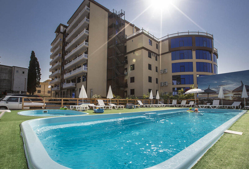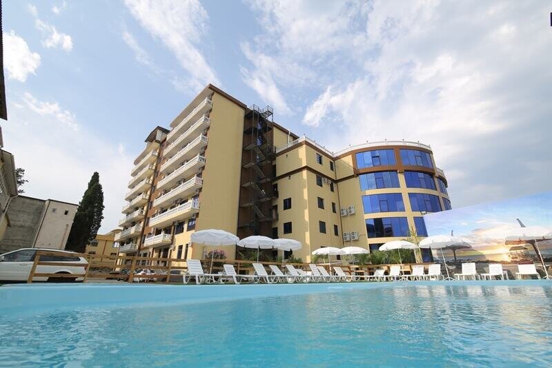 На территории гостиничного комплекса расположен большой бассейн с детским отделением, а также зоной отдыха с шезлонгами и зонтиками. Для взрослых и детей созданы все условия для комфортного отдыха. Работает только в высокий сезон.