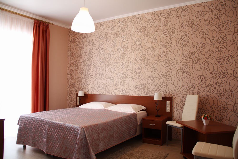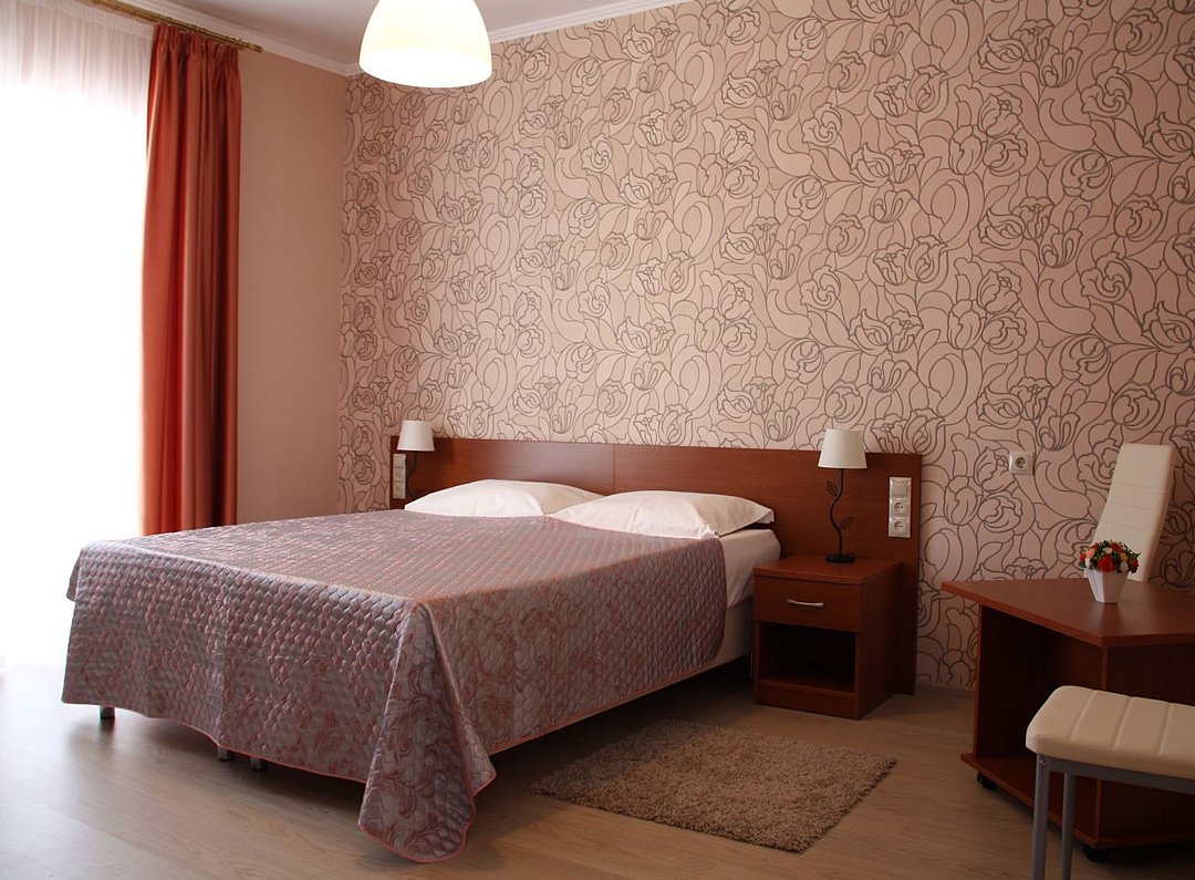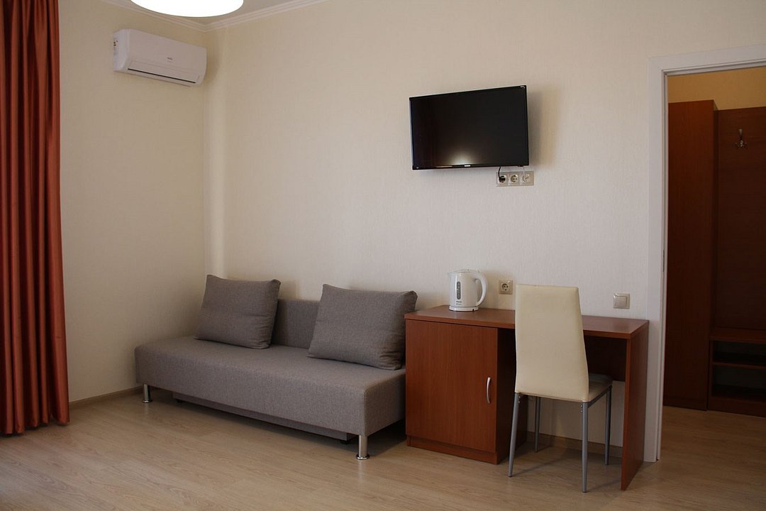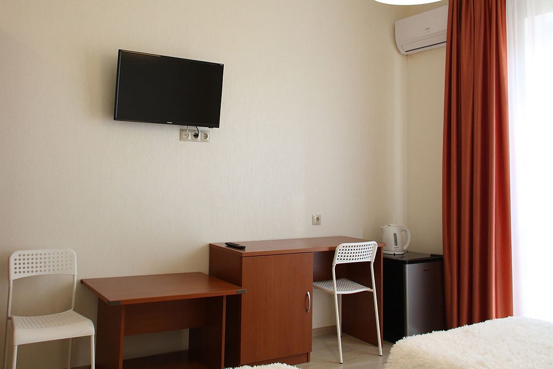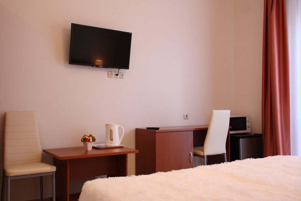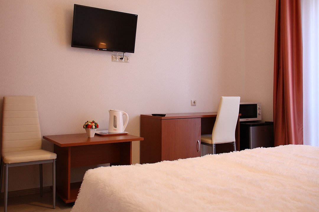 телевизор, Wi-Fi, настольные лампы, утюг, санузел, банные полотенца, балкон, двуспальная кровать, шкаф для одежды, вешалки, журнальный столик, письменный стол, набор посуды, сейф, чайник, обеденная зона, стул, тумба, сплит-система, мини-холодильник, москитная сетка, уборка номера, мыло, прачечная (за дополнительную плату), можно с питомцамиВ гостиничном номере
