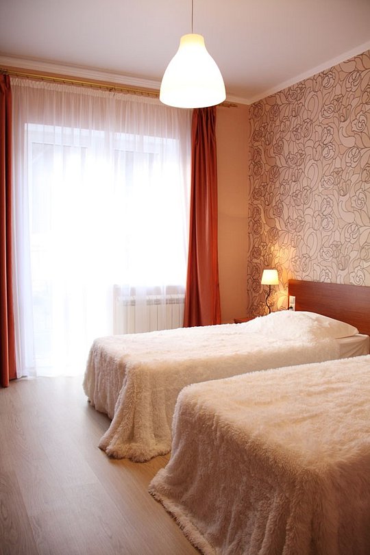 Комфортабельный 3-х местный номер, который включает одну двуспальную или две односпальные кровати и диван-кровать. В номере есть - телевизор; - чайник; - мини-холодильник; - микроволновка; - набор посуды на 3-х человек; - WI-FI. На первом этаже есть отдельный выход из номера. На втором этаже номер с балконом.Услуги и удобства