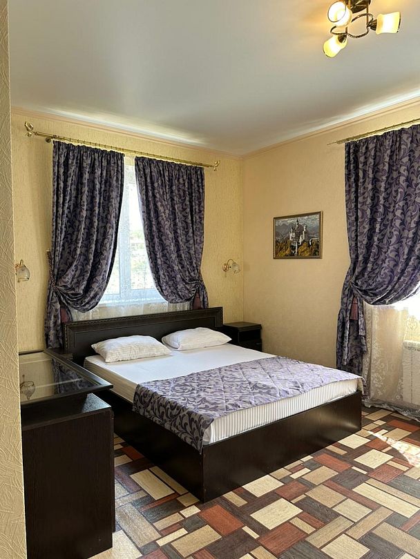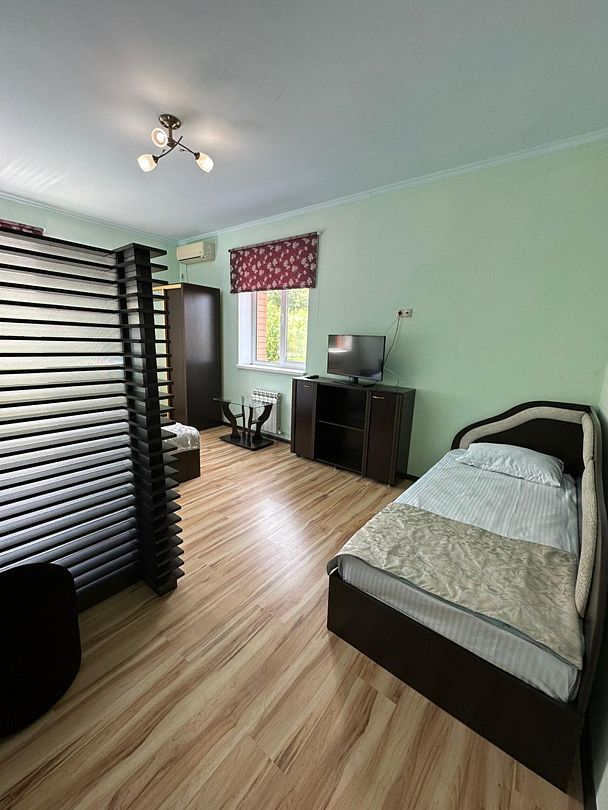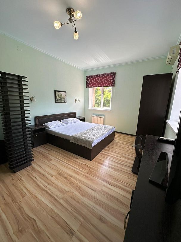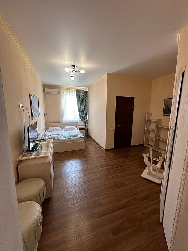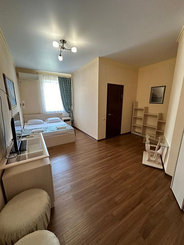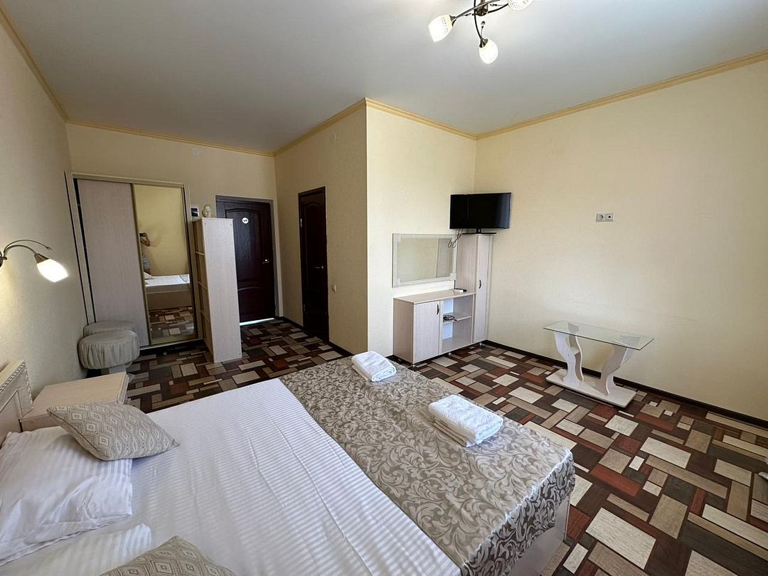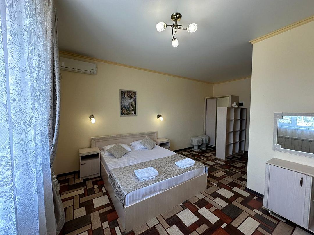 В номере: двуспальная кровать с ортопедическим матрасом, кондиционер, телевизор, стабильный Wi-Fi.