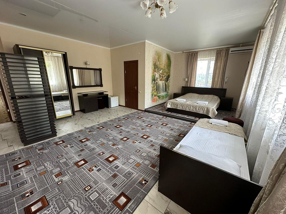Номер 34 в гостинице «Аврора Хиллс» — это просторный и уютный четырёхместный номер, оснащённый одной двуспальной кроватью и двумя удобными полуторными. Идеально подойдёт для семьи или небольшой компании.