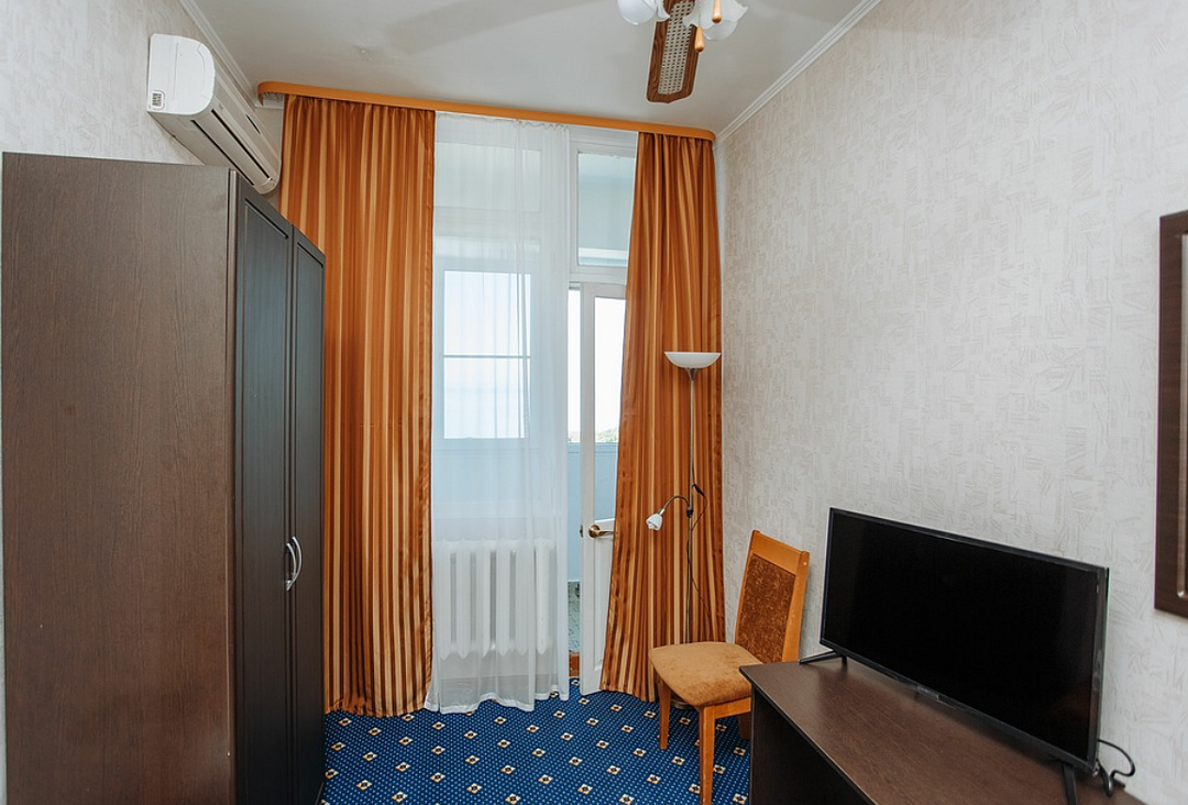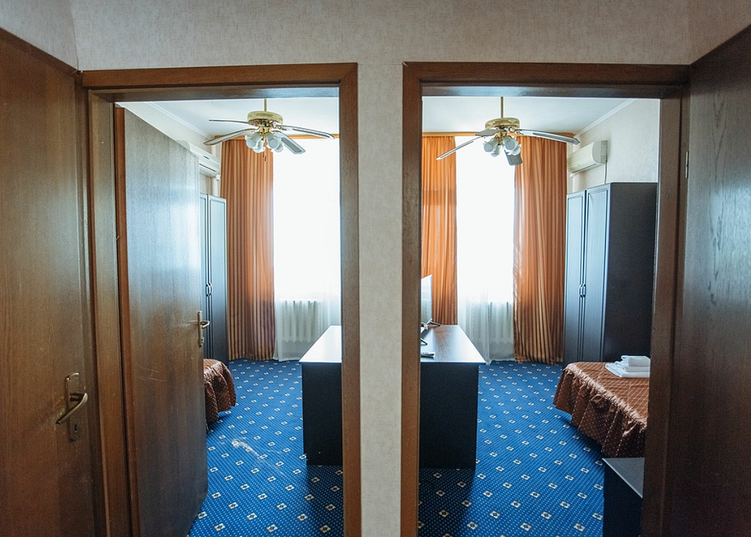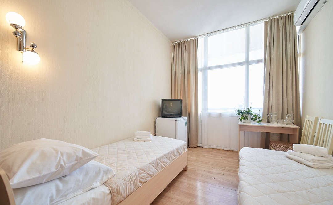 Две независимые комнаты с общей прихожей. Небольшой, уютный номер с односпальными кроватями (90*200 см) и балконом в каждой. В блоках (1+1) возможно размещение незнакомых друг другу людей - каждая комната закрывается на ключ, санитарные удобства общие на 2 комнаты. В каждом номере имеется кондиционер, телевизор, холодильник, балкон, а также набор необходимой мебели.