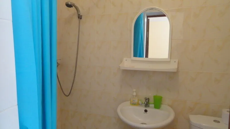 В каждом номере есть сан.узел , площадью 3,4 кв.м.(раковина, унитаз и душ),горячая и холодная вода 24 часа в сутки. Каждый номер имеет «личную» территорию со столом и стульями. Оснащение номеров: 2-х спальная кровать и две односпальные, прикроватные тумбочки, шифоньер, телевизор, холодильник и кондиционер.