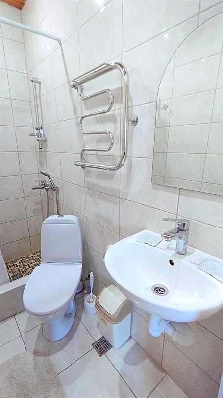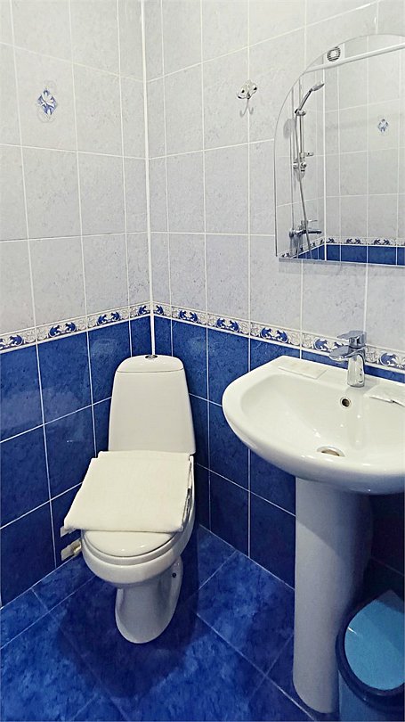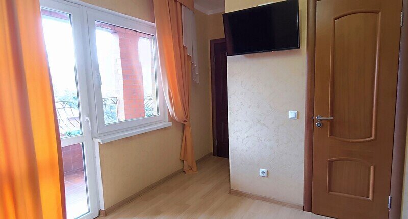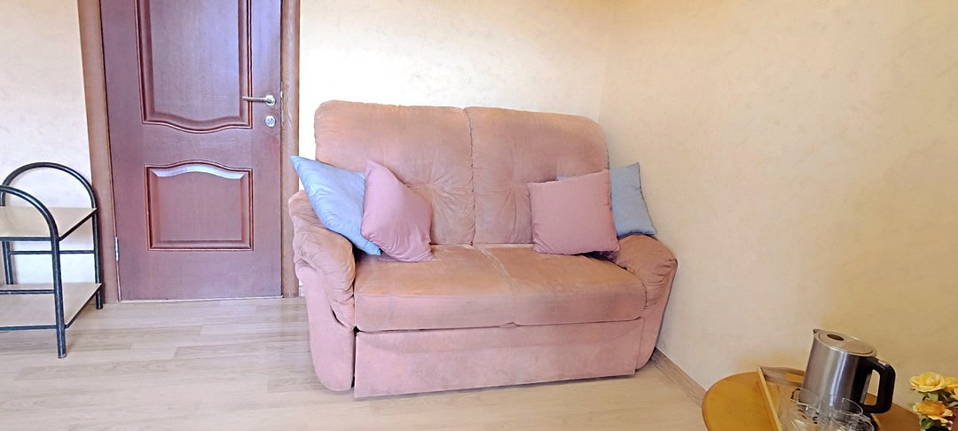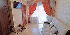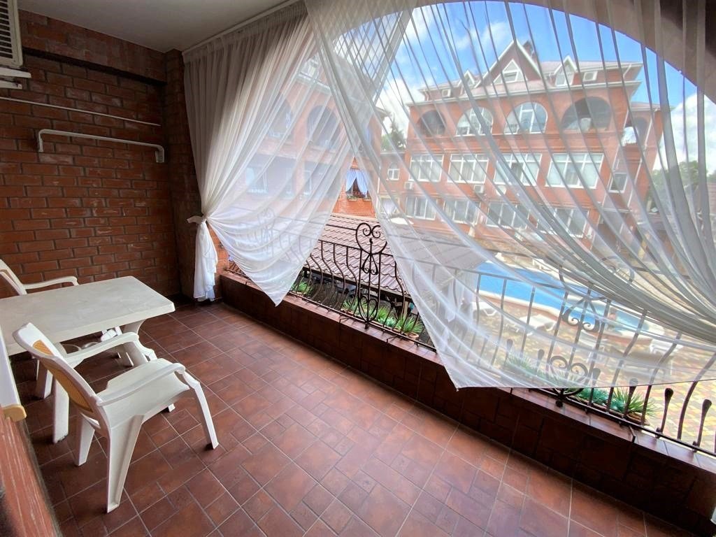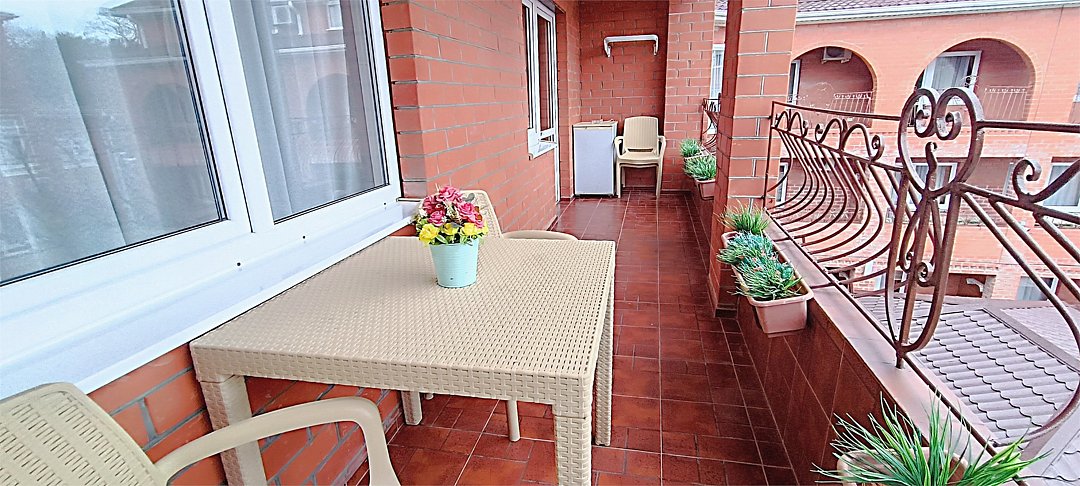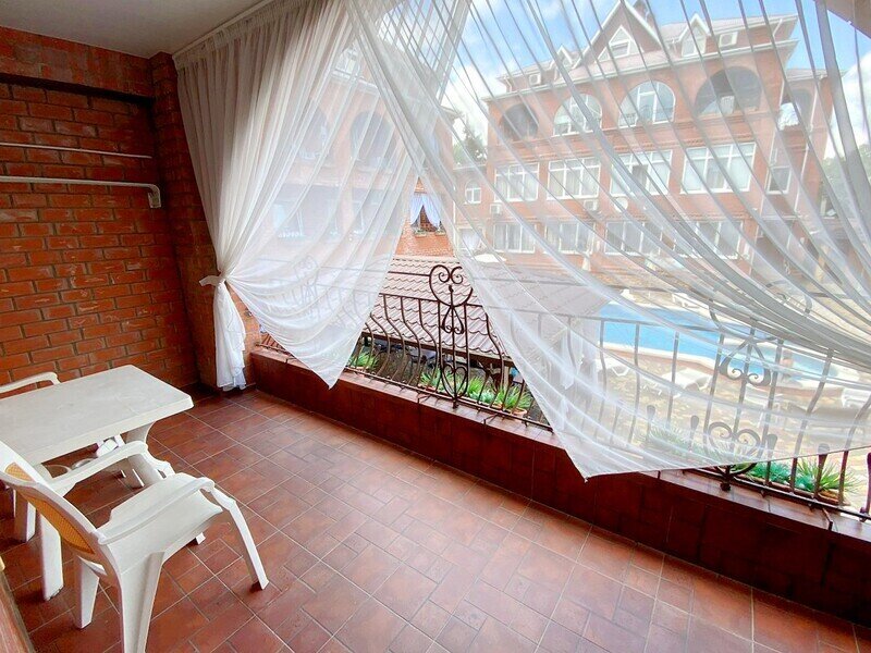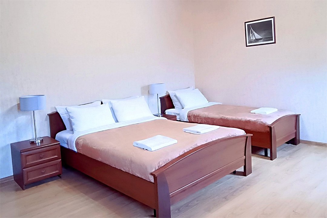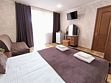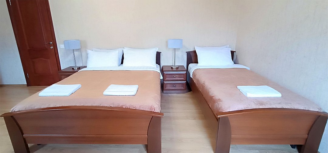 Просторный трехместный номер состоит из двух комнат, санузла и большой лоджии. Номер оснащен двуспальной кроватью с ортопедическим матрасом, раскладным диваном, тумбочками, шкафом для одежды, туалетным столиком с пуфиком, журнальным столиком, зеркалом, холодильником, кондиционером, телевизором с плоским экраном, чайником. Санузел совмещенный с душевой кабиной. Номер укомплектован постельным бельем, полотенцами, тапочками, мыльными принадлежностями.Услуги и удобства