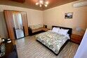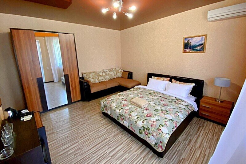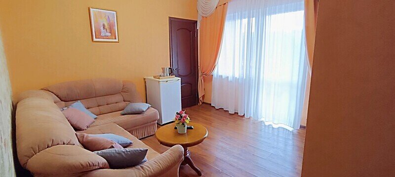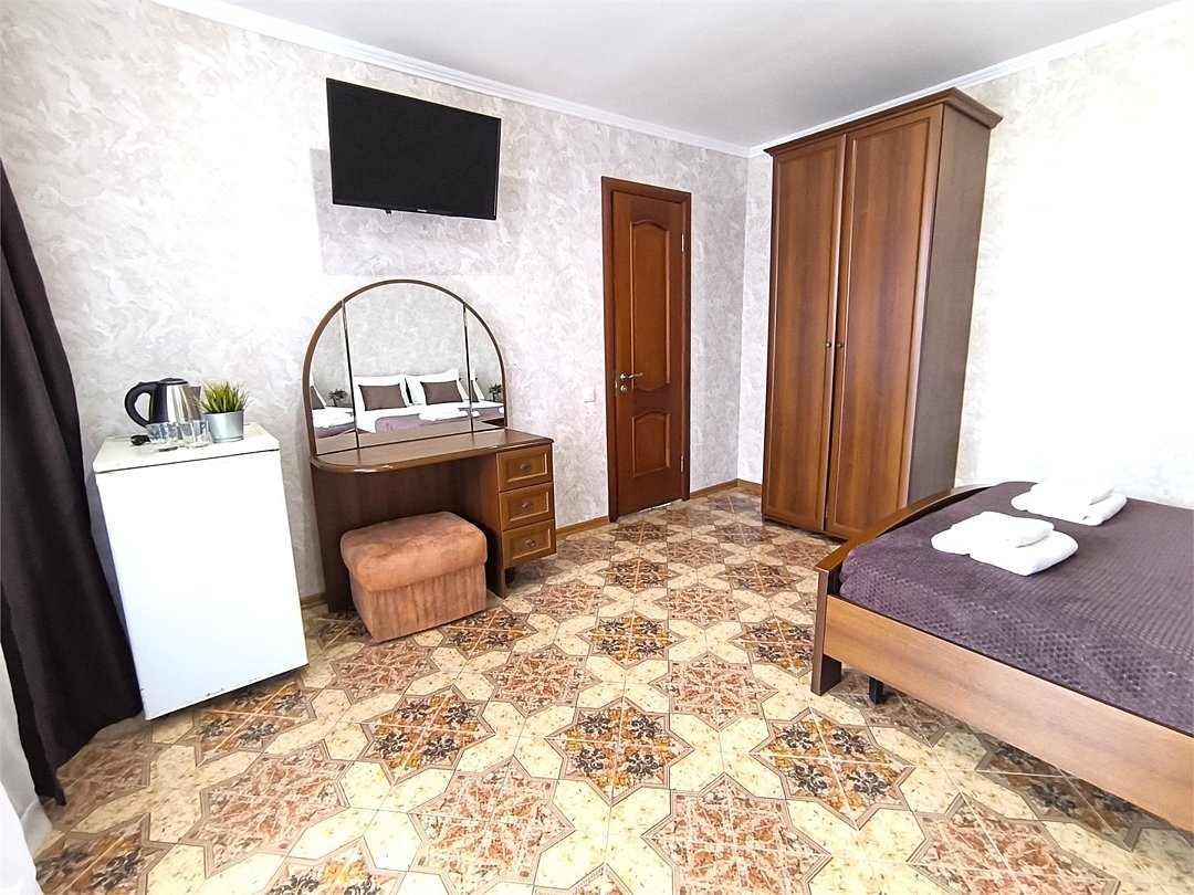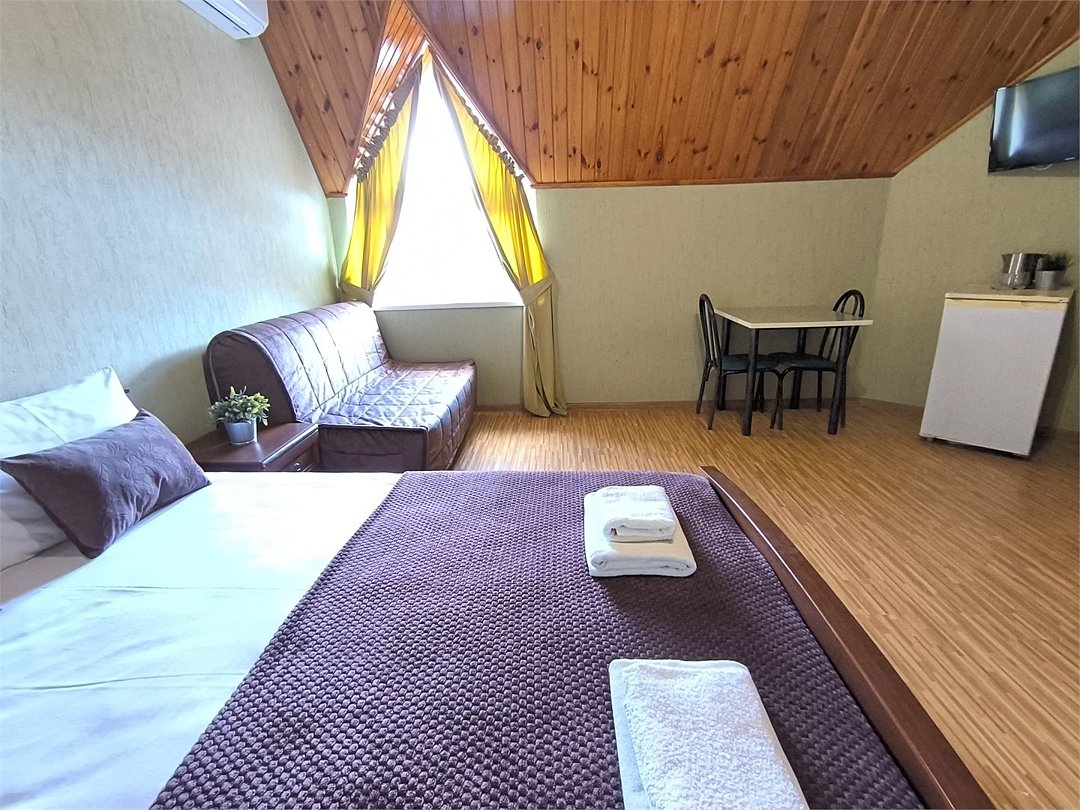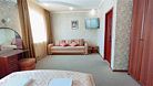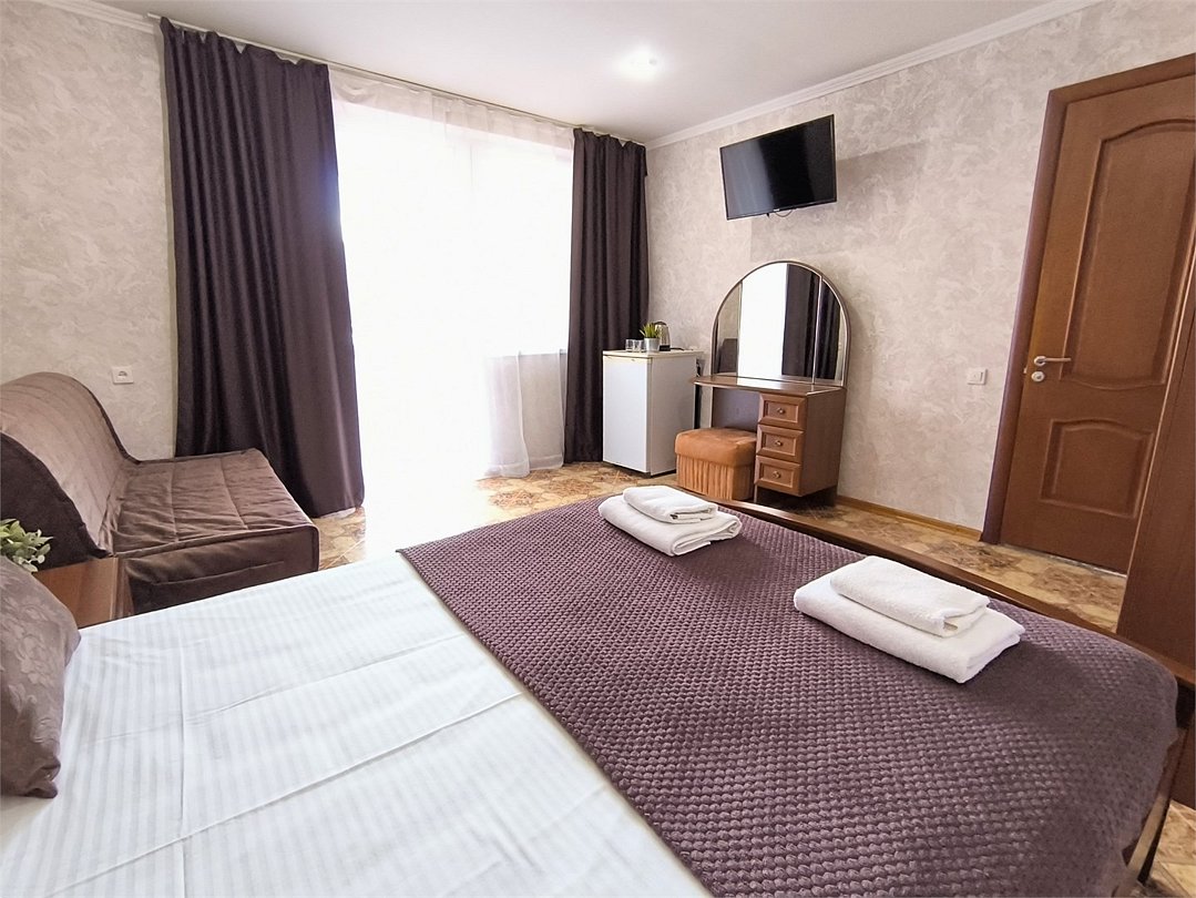 Просторный семейный номер вмещает до 5 гостей. Состоит из коридора, комнаты и санузла. Номер оснащен двуспальной кроватью с ортопедическим матрасом и двуспальным диваном, тумбочками, шкафом для одежды, туалетным столиком с зеркалом, холодильником, кондиционером, телевизором с плоским экраном, чайником. Санузел совмещенный с душевой кабиной. Номер укомплектован постельным бельем, полотенцами, тапочками, мыльными принадлежностями.Услуги и удобства