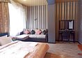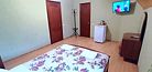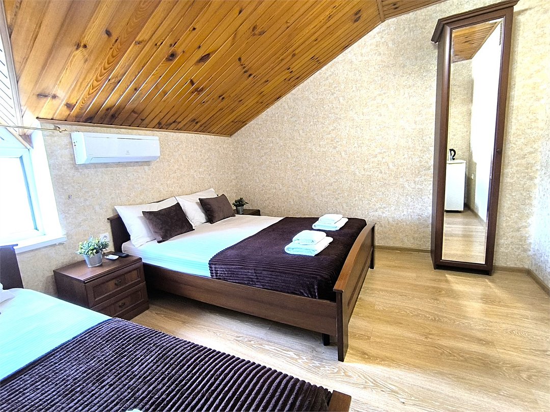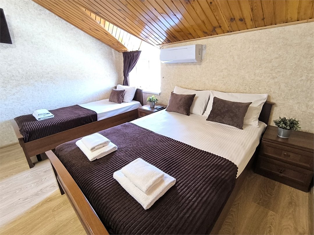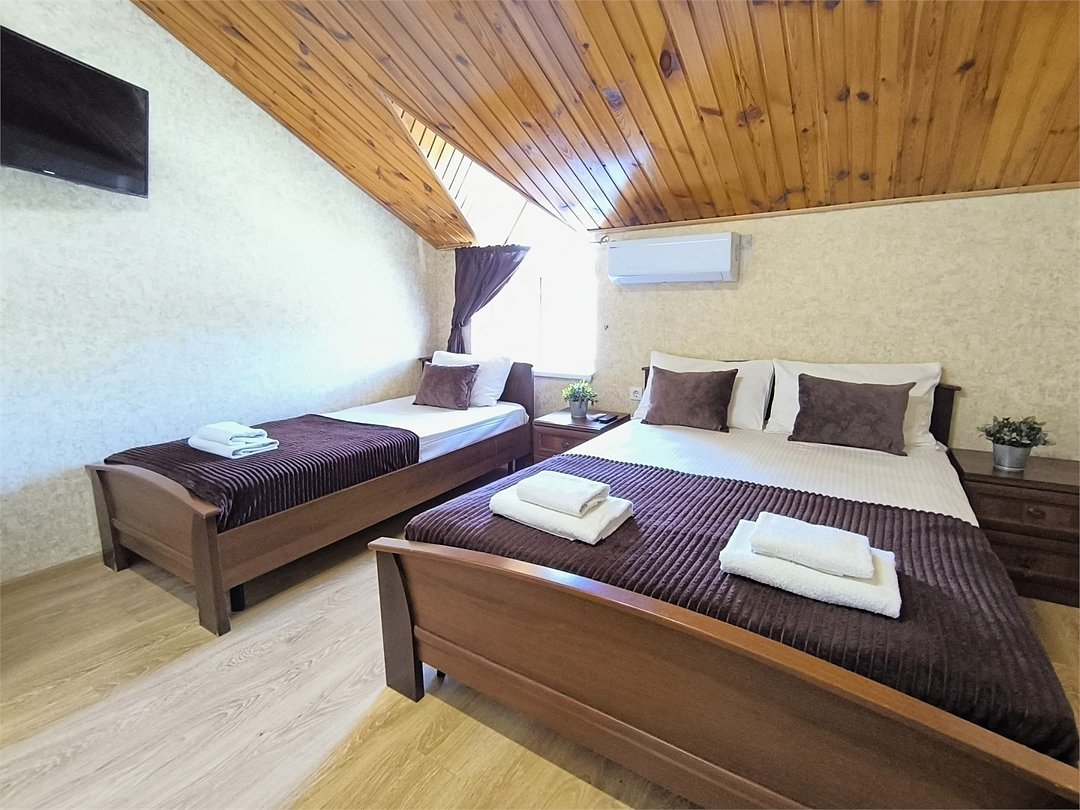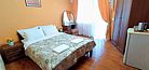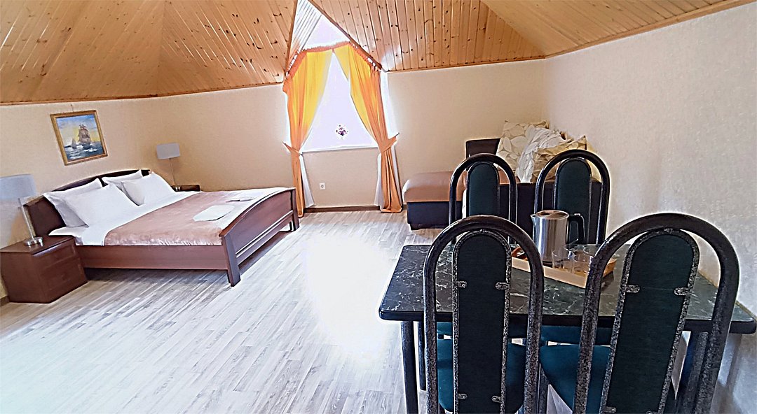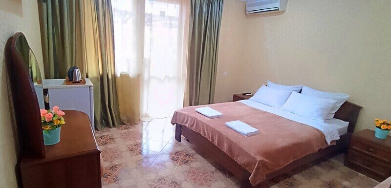 Просторный семейный номер вмещает до 5 гостей. Состоит из коридора, комнаты и санузла. Номер оснащен двуспальной кроватью с ортопедическим матрасом и двуспальным диваном, тумбочками, шкафом для одежды, туалетным столиком с зеркалом, холодильником, кондиционером, телевизором с плоским экраном, чайником. Санузел совмещенный с душевой кабиной. Номер укомплектован постельным бельем, полотенцами, тапочками, мыльными принадлежностями.Услуги и удобства