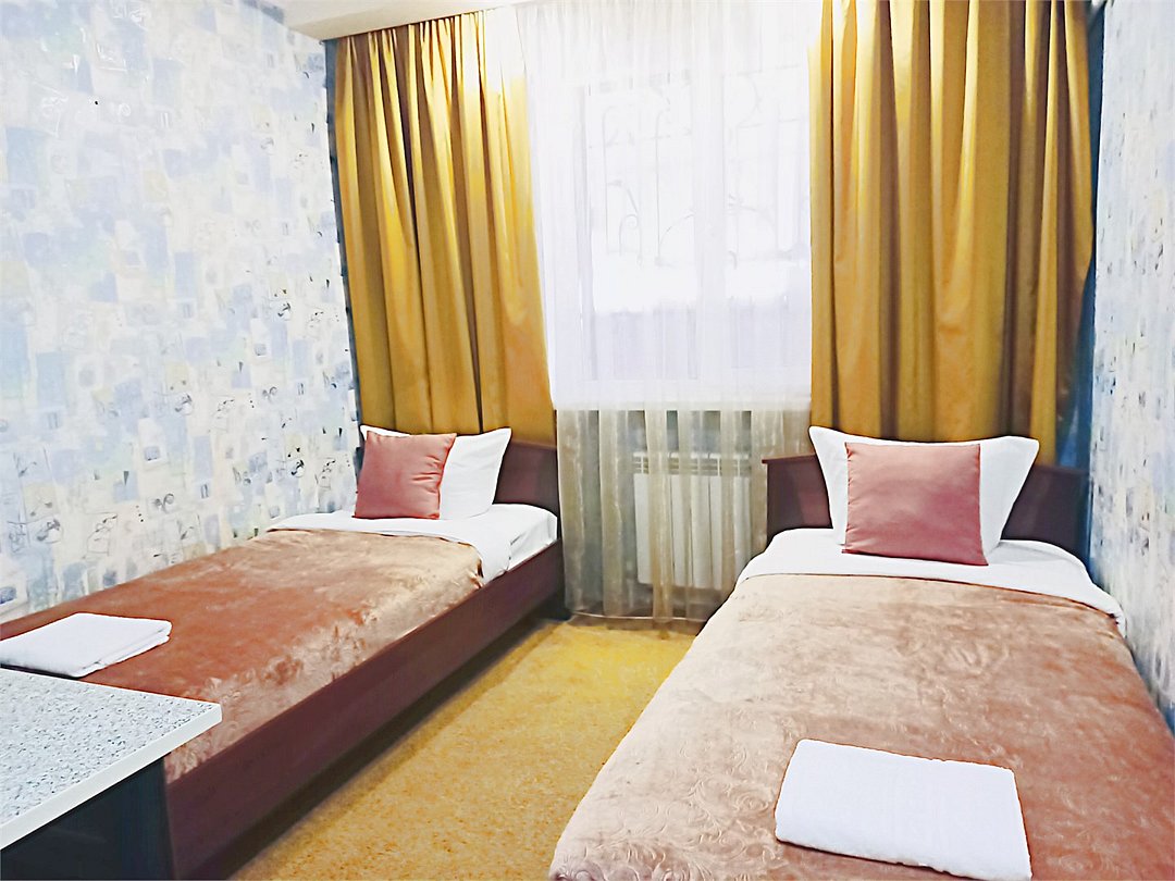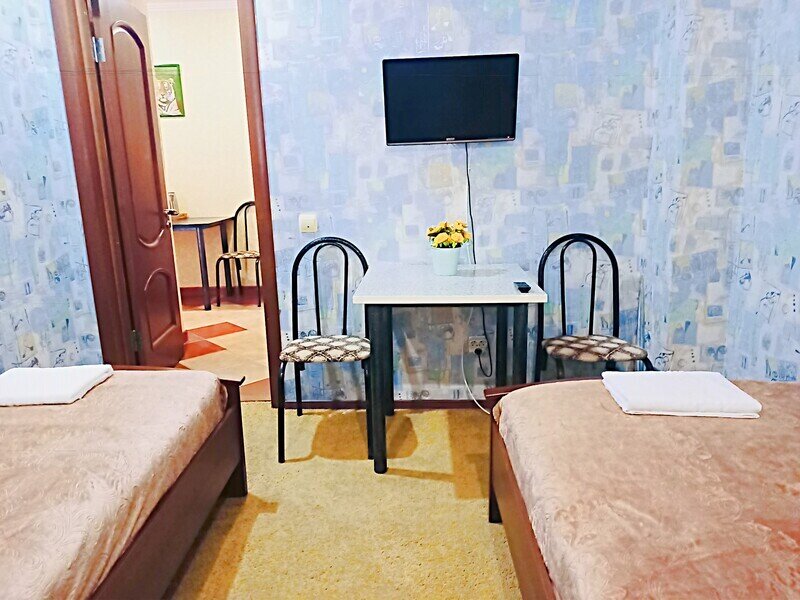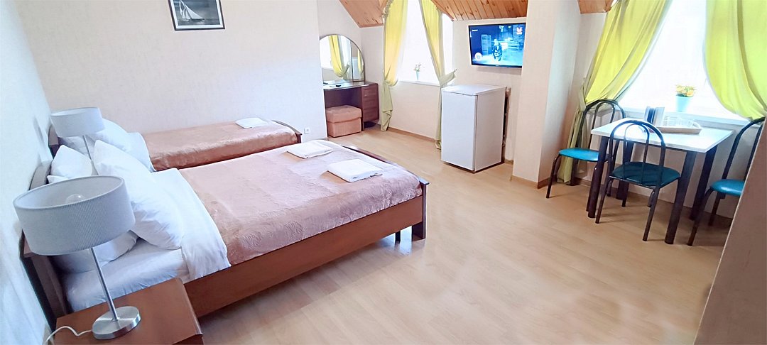 Просторный четырехместный номер состоит из двух комнат, санузла и коридора. Номер оснащен двуспальной кроватью с ортопедическим матрасом, двумя односпальными кроватями, тумбочками, шкафом для одежды, туалетным столиком с пуфиком, журнальным столиком, зеркалом, обеденной зоной, холодильником, кондиционером, телевизором с плоским экраном, чайником. Санузел совмещенный с душевой кабиной. Номер укомплектован постельным бельем, полотенцами, тапочками, мыльными принадлежностями.Услуги и удобства