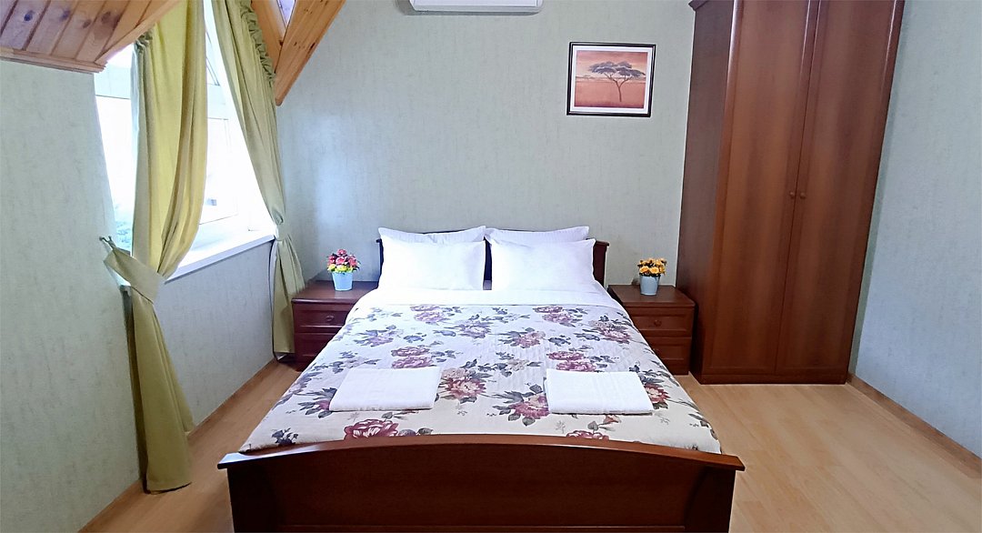 Уютный двухместный номер, площадью 14м2, состоит из одной комнаты и санузла. Номера данной категории расположены на 4-ом мансардном этаже. На верхние этажи подняться можно только по лестнице. Номер оснащен двуспальной кроватью с ортопедическим матрасом, тумбочками, шкафом для одежды, туалетным столиком с пуфиком, зеркалом, холодильником, кондиционером, телевизором с плоским экраном, чайником. Санузел совмещенный с душевой кабиной. Номер укомплектован постельным бельем, полотенцами, тапочками, мыльными принадлежностями.Услуги и удобства