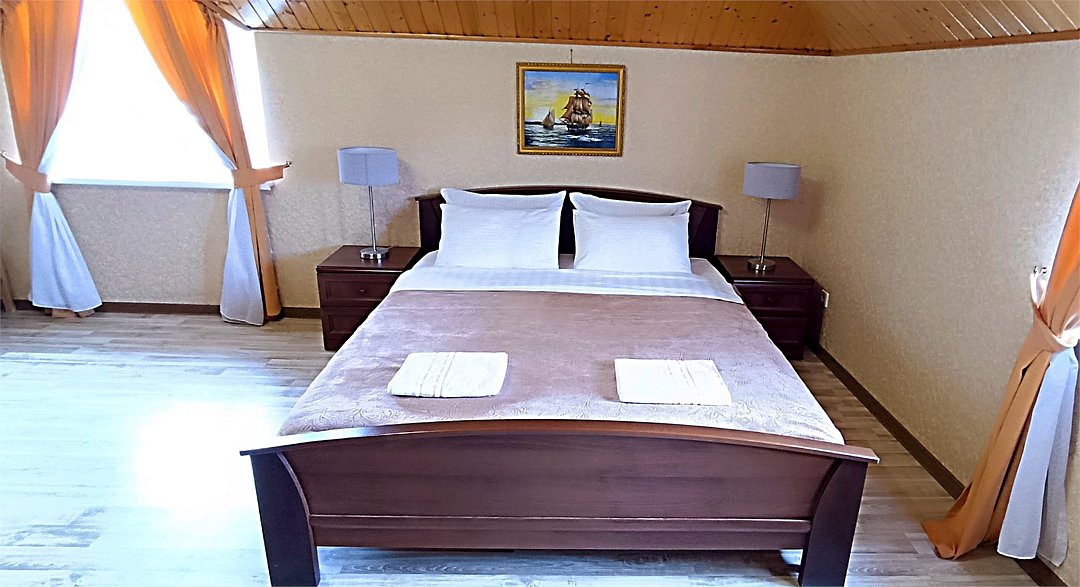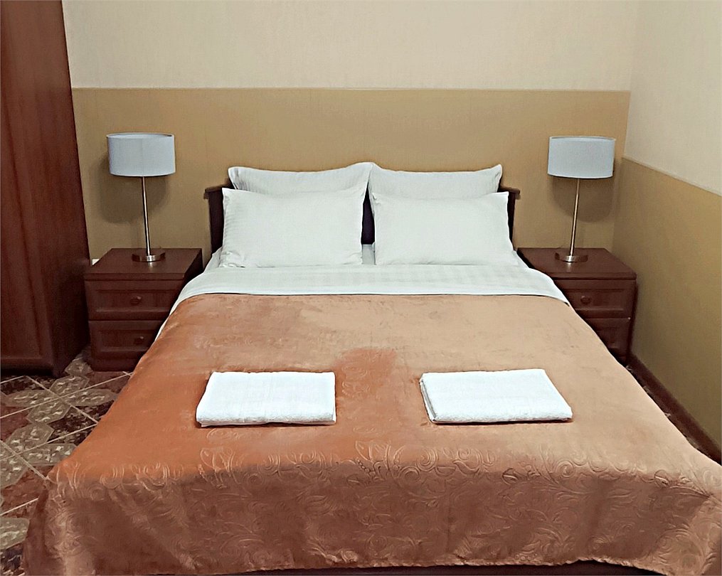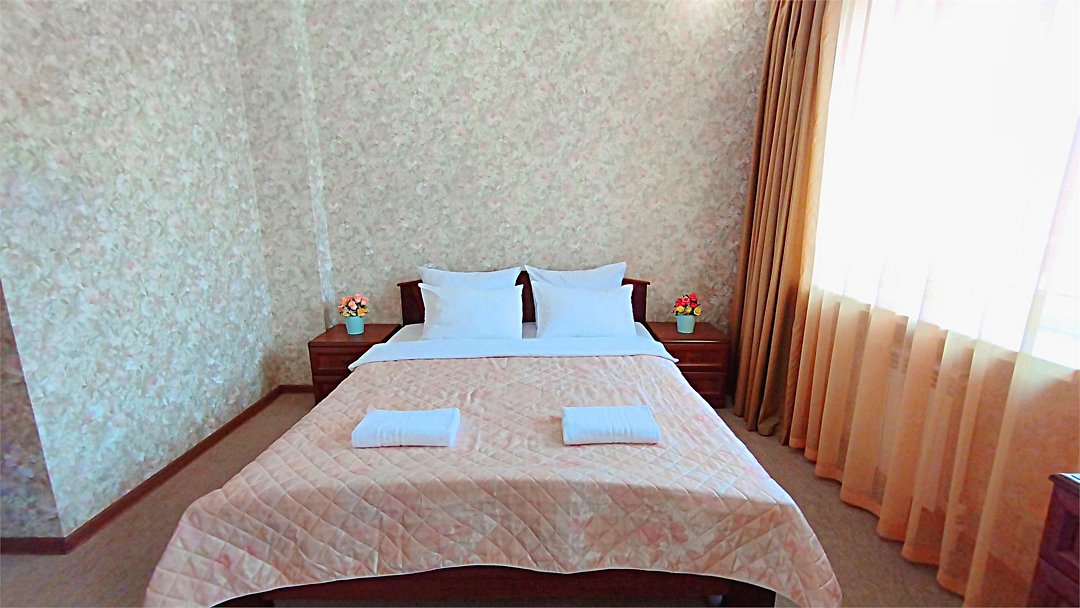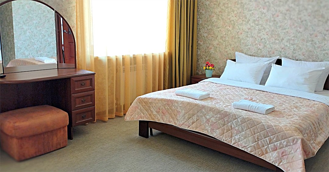 Уютный двухместный номер состоит из одной комнаты и санузла. Из номера выход на просторный балкон. Номер оснащен двуспальной кроватью с ортопедическим матрасом, тумбочками, шкафом для одежды, туалетным столиком с пуфиком, зеркалом, холодильником, кондиционером, телевизором с плоским экраном, чайником. Санузел совмещенный с душевой кабиной. Номер укомплектован постельным бельем, полотенцами, тапочками, мыльными принадлежностями.Услуги и удобства