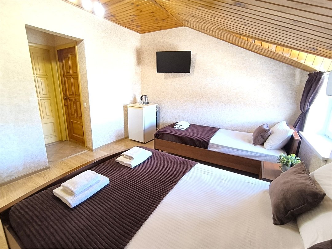 Уютный трехместный номер, площадью 15м2, состоит из одной комнаты и санузла. Номера данной категории расположены на 4-ом мансардном этаже. На верхние этажи подняться можно только по лестнице. Номер оснащен двуспальной и односпальной кроватями с ортопедическими матрасами, тумбочками, шкафом для одежды, туалетным столиком с зеркалом, мини-холодильником, кондиционером, телевизором с плоским экраном, чайником. Санузел совмещенный с душевой кабиной. Номер укомплектован постельным бельем, полотенцами, тапочками, мыльными принадлежностями.Услуги и удобства