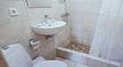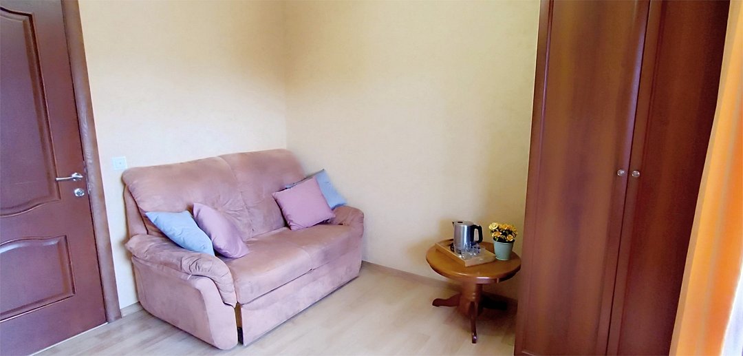 Уютный семейный номер, площадью 16м2, состоит из коридора, комнаты и санузла. Номера данной категории расположены на 3 этаже. На верхние этажи подняться можно только по лестнице. Номер оснащен двуспальной и раскладным диваном (140*200), тумбочками, шкафом для одежды, туалетным столиком с зеркалом, мини-холодильником, кондиционером, телевизором с плоским экраном, чайником. Санузел совмещенный с душевой кабиной. Номер укомплектован постельным бельем, полотенцами, тапочками, мыльными принадлежностями.Услуги и удобства