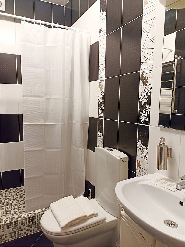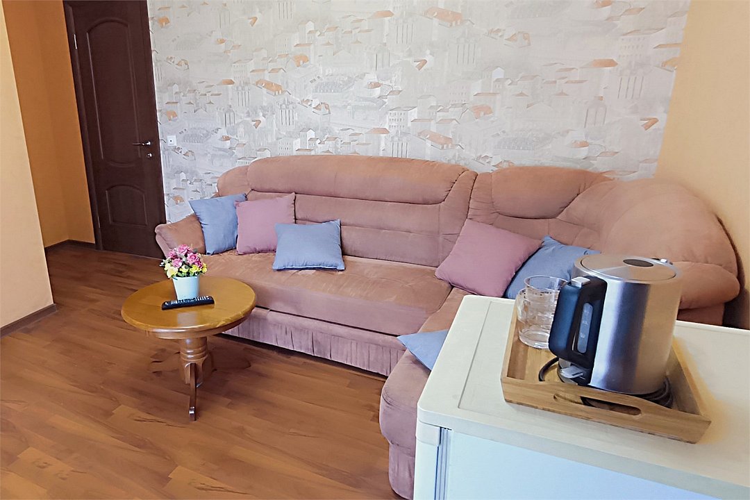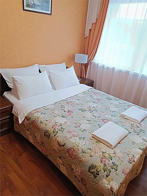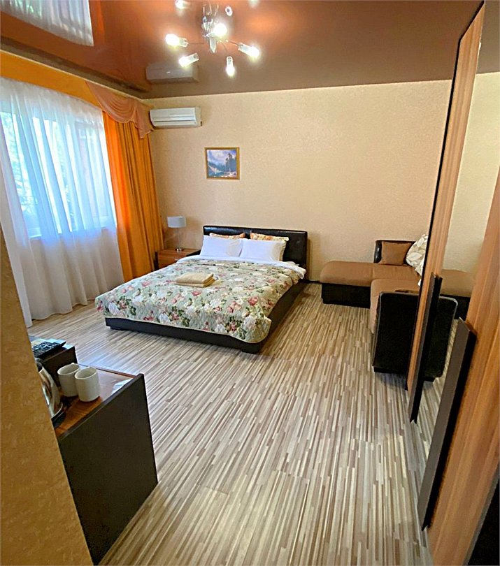 Просторный четырехместный номер состоит из двух комнат, санузла и большой лоджии. Номер оснащен двуспальной кроватью с ортопедическим матрасом, двуспальным диваном, тумбочками, шкафом для одежды, туалетным столиком с пуфиком, журнальным столиком, зеркалом, холодильником, кондиционером, телевизором с плоским экраном, чайником. Санузел совмещенный с душевой кабиной. Номер укомплектован постельным бельем, полотенцами, тапочками, мыльными принадлежностями.Услуги и удобства