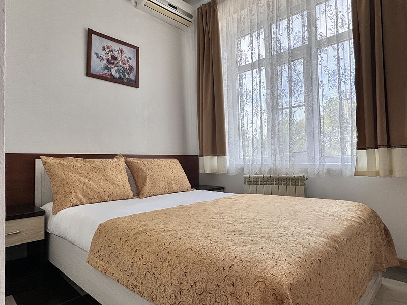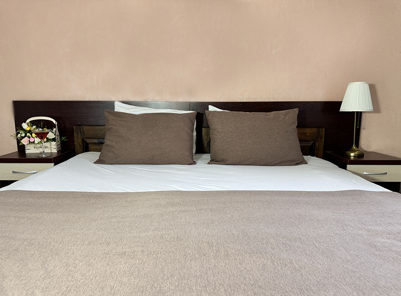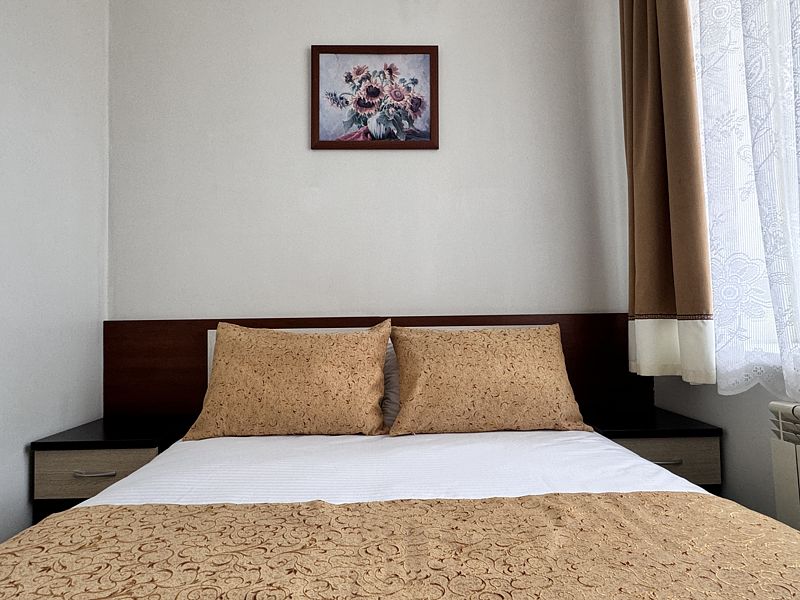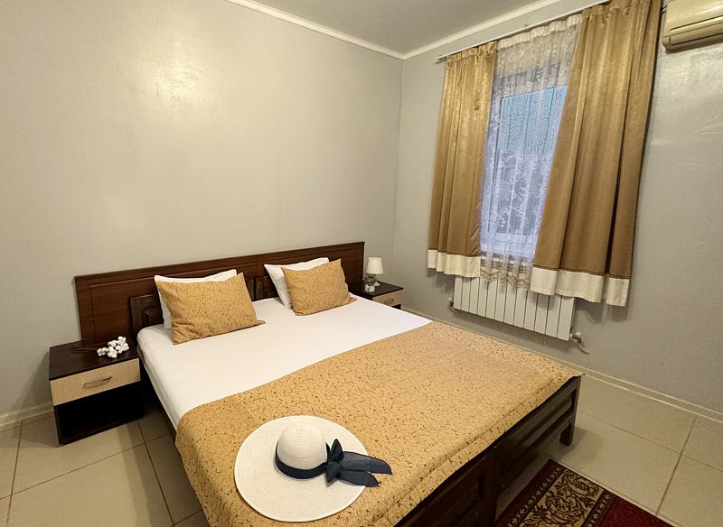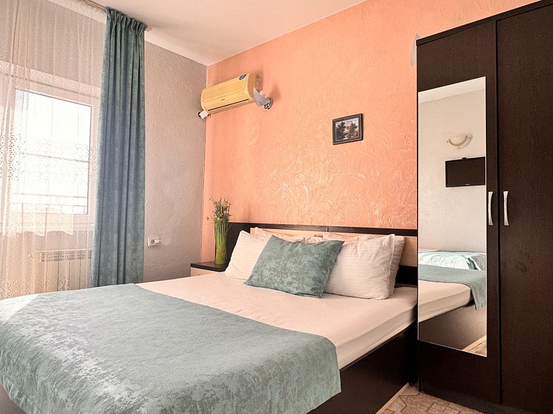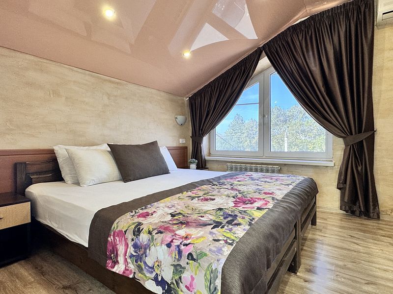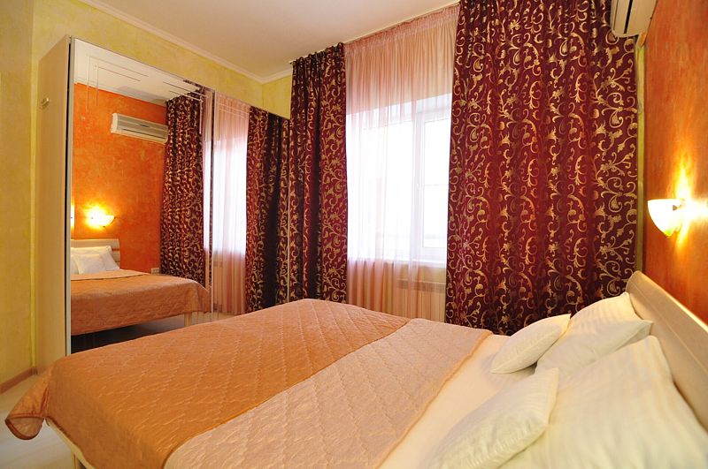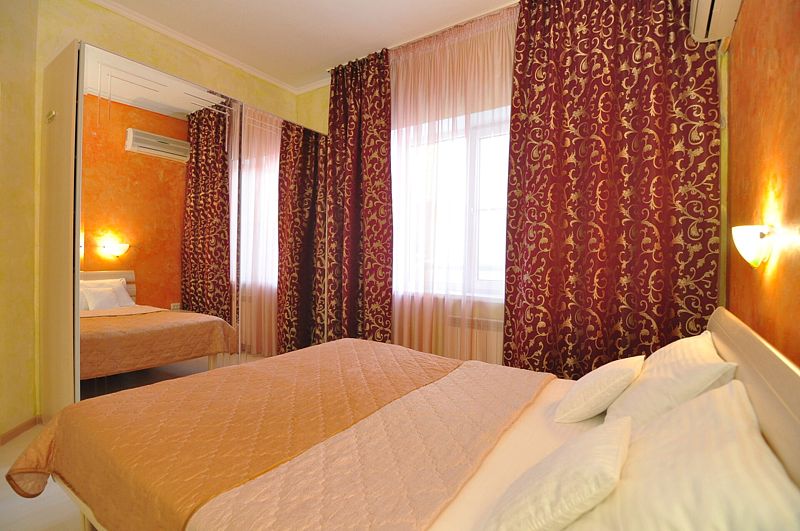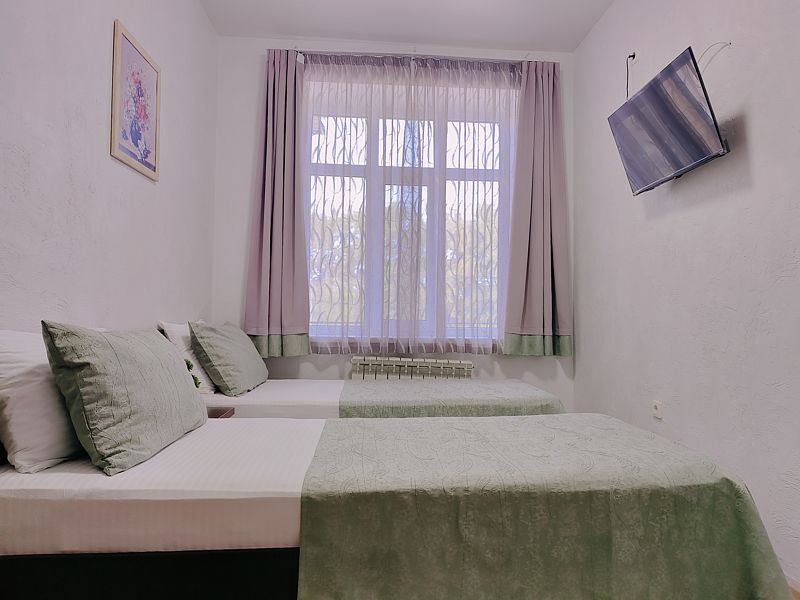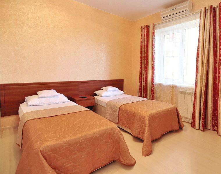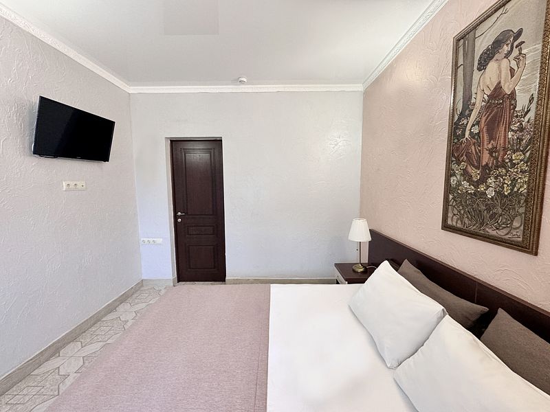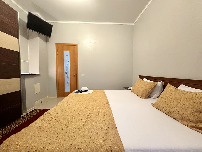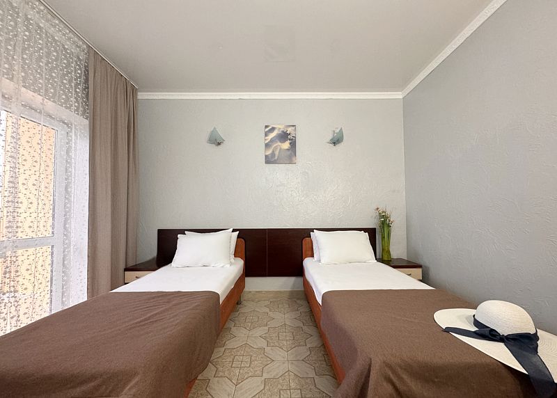 Современные номера различных категорий оснащены собственным санузлом с душем, удобной мебелью, сплит-системой, холодильником и телевизором. Для маленьких гостей предусмотрены места для установки дополнительных кроватей.