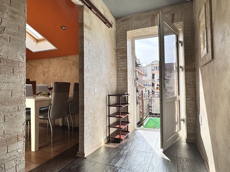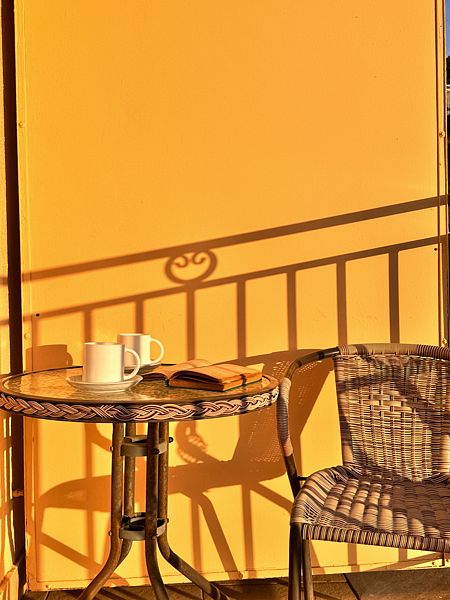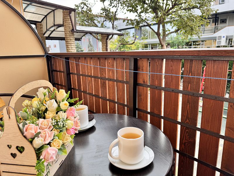 Перед входом в номер расположена зона отдыха с летней мебелью, столом и стульями.