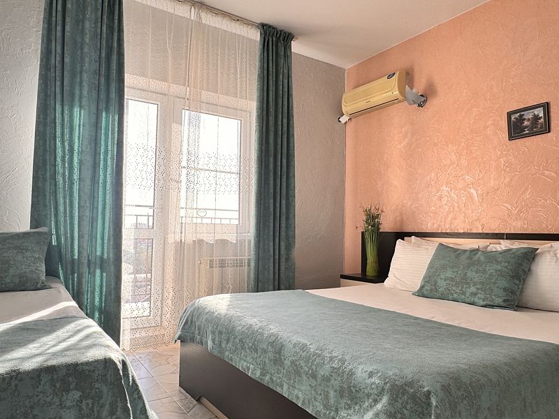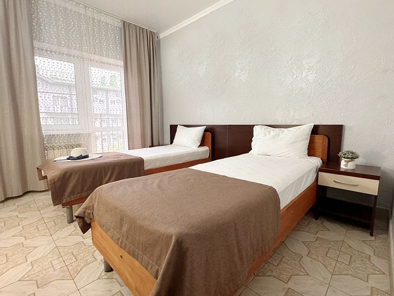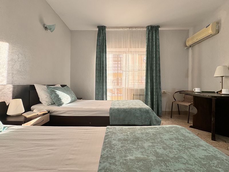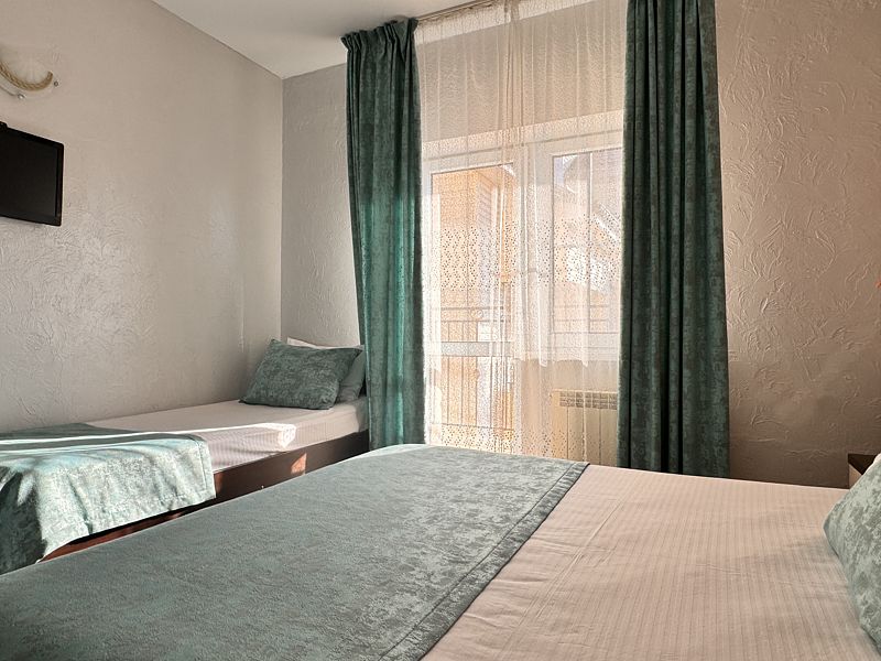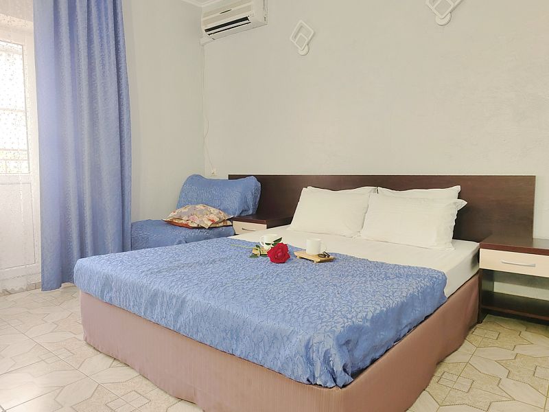 Номер оснащен: 3-мя односпальными кроватями или односпальной кроватью и двуспальной кроватью, прикроватными тумбочками, бра, телевизором, кондиционером, шкафом, вешалкой, зеркалом, чайником, мини-холодильником, феном. Балкон оборудован летней мебелью для отдыха на свежем воздухе, столом и стульями.
