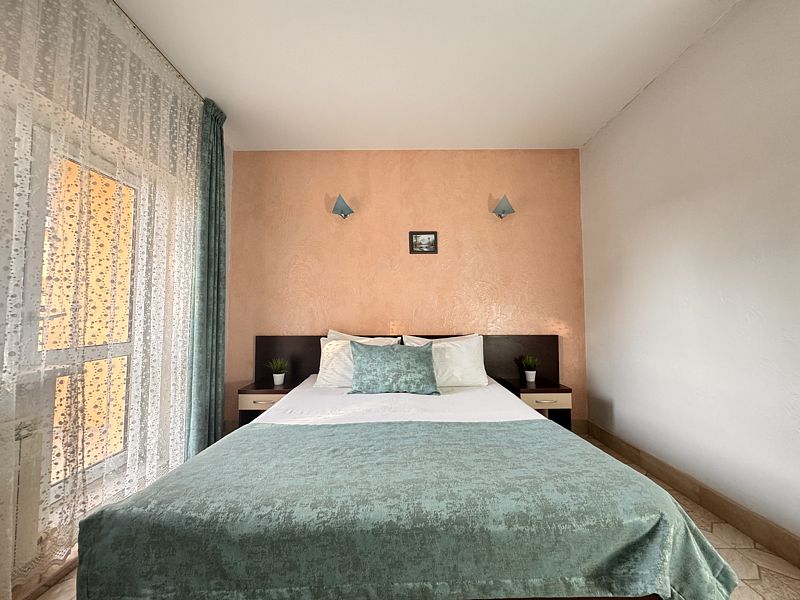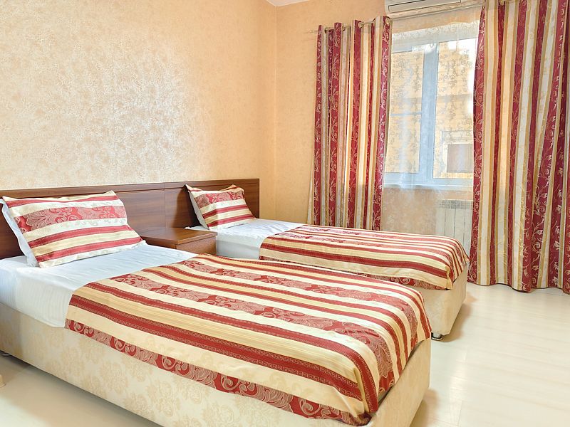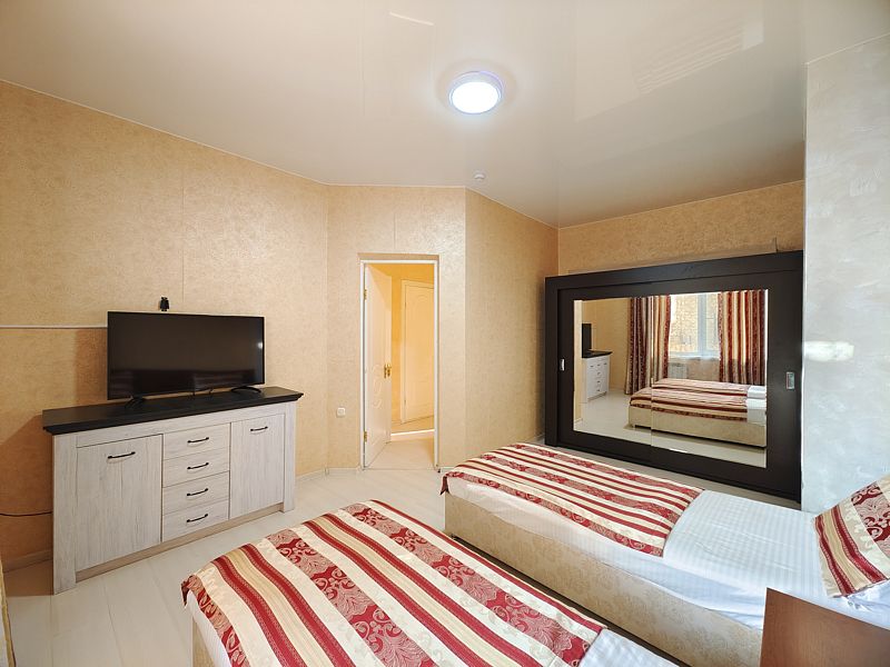 Номер оборудован всем необходимым для комфортного проживания. Спальня 1 оснащена: двуспальной кроватью, прикроватными тумбочками, телевизором, кондиционером. Спальня 2 оснащена: 2-мя односпальными кроватями, прикроватными тумбочками, телевизором, кондиционером, комодом, зеркалом.