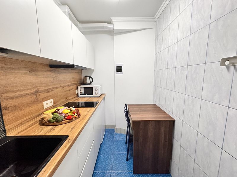 Кухня: кухонный гарнитур, двухконфорочная варочная панель, холодильник, чайник, микроволновая печь, набор посуды, обеденный столик.
