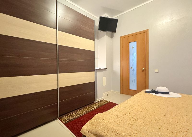 Спальня 1 оснащена: двуспальной кроватью, мебельной стенкой с полочками и шкафчиками для хранения вещей, прикроватными тумбочками, кондиционером, телевизором, журнальным столиком. Балкон оборудован летней мебелью для отдыха, столом и стульями. Спальня 2: двуспальная кровать, бра, прикроватные тумбочки, кондиционер, шкаф для хранения вещей, сейф. В коридоре находится комод и зеркало, гладильная доска и утюг, сушилка для одежды вещей. Спальня 3: 2-е односпальные кровати, прикроватная тумбочка, шкаф для хранения вещей, комод, телевизор, кондиционер.