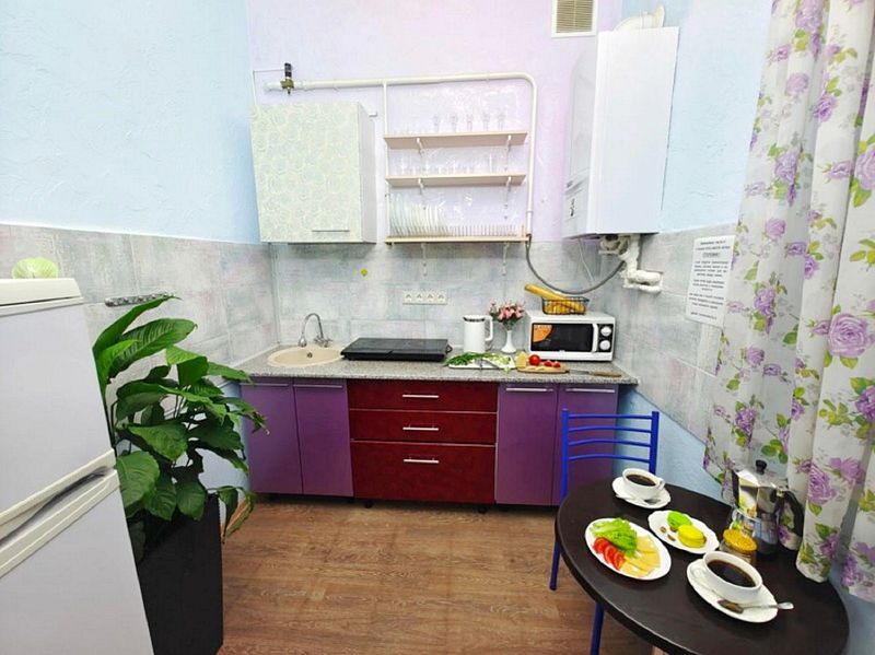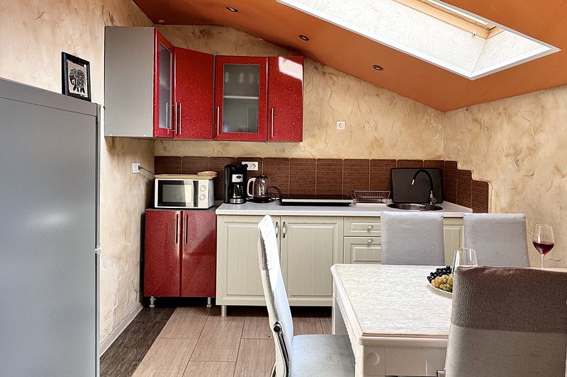 Для гостей всем необходимым оборудована кухня: кухонным гарнитуром, обеденным столиком и стульями, микроволной печью, чайником, холодильном, двухкомфорочной варочной панелью для приготовления еды, набором посуды и столовыми приборами.