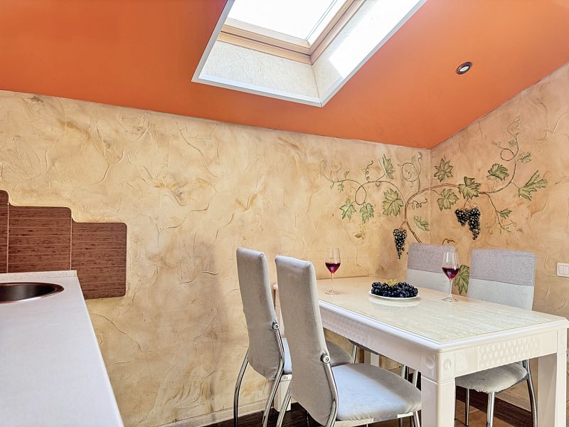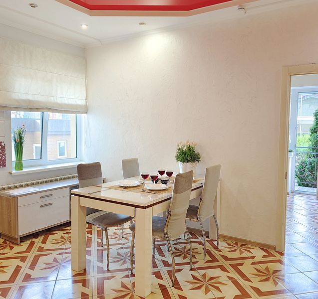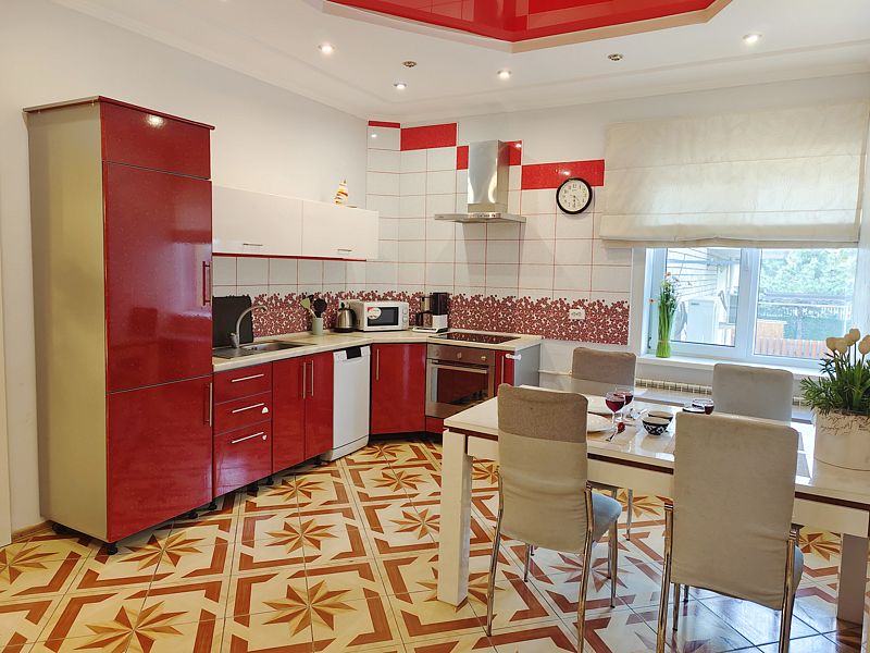 Для удобства гостей номер оборудован кухней: кухонный гарнитур, чайник, холодильник, микроволновая печь, посудомоечная машина, обеденный стол и стулья, варочная панель, посудомоечная машина.