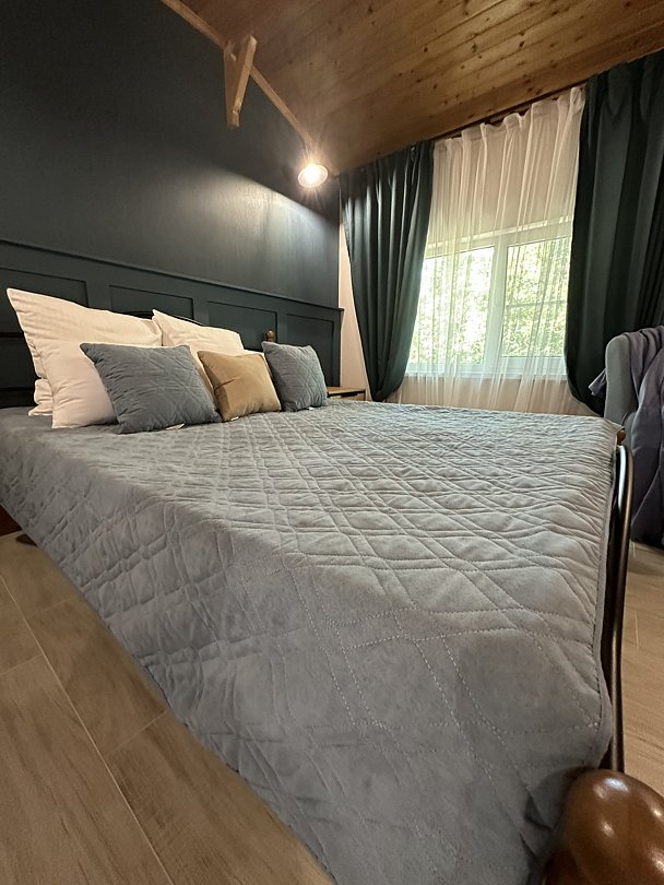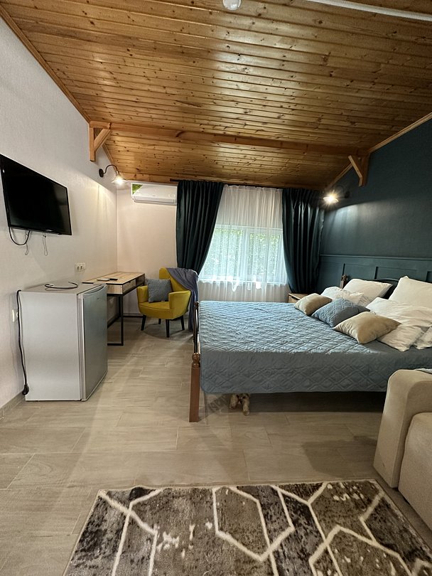 В номере Комфорт есть все необходимое для комфортного проживания: двуспальная кровать и диван-кровать, прикроватные тумбы, туалетный столик, пуфик, шкаф, холодильник, телевизор, сплит-система, москитные сетки на окнах. Ванная комната с душем, унитазом, раковиной, жидким мылом, туалетной бумагой и банным и лицевым полотенцем для каждого гостя. Цвета мебели и стен в номерах могут различаться. Обратите внимание, что курение в номерах запрещено. Стоимость проживания включает питание по выбранному тарифу. Во время проживания у вас есть возможность пользоваться подогреваемым бассейном (с 01 мая), детской площадкой и детской комнатой, имеется аниматор. За дополнительную плату можно воспользоваться зоной для приготовления барбекю и парковкой, бильярдным и теннисным столами.
