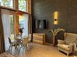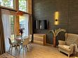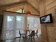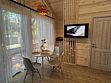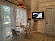 Коттедж семейный площадью 44 м² с видом во двор. Подходит для размещения четырех человек. Имеет спальню с приятным интерьером и гостиную. В номере одна двуспальная кровать и один двуспальный диван. Имеется телевизор, кондиционер, шкаф, вешалка, журнальный столик, холодильник и стулья.
