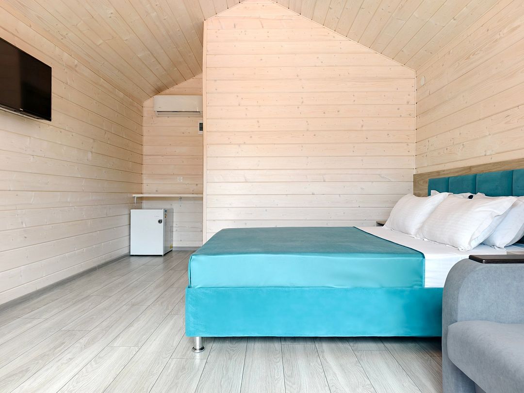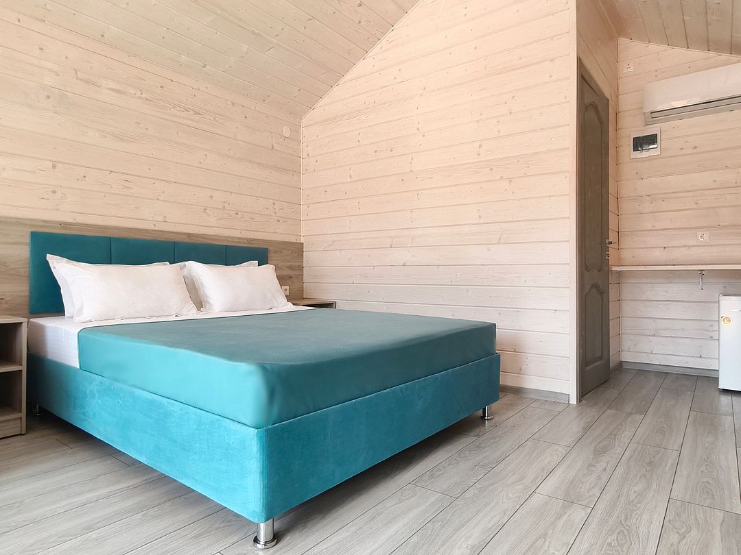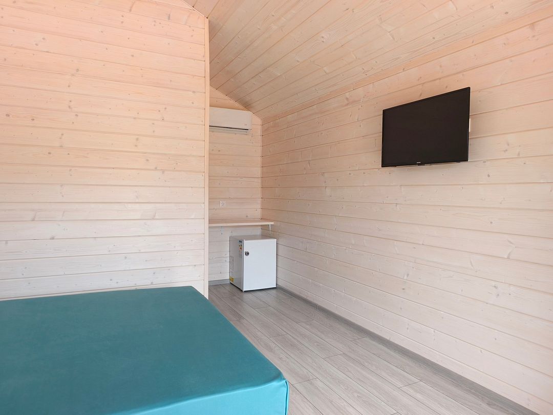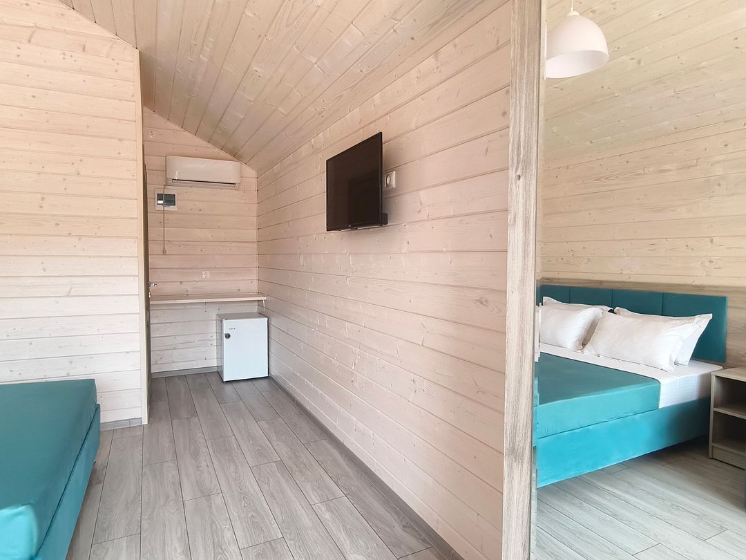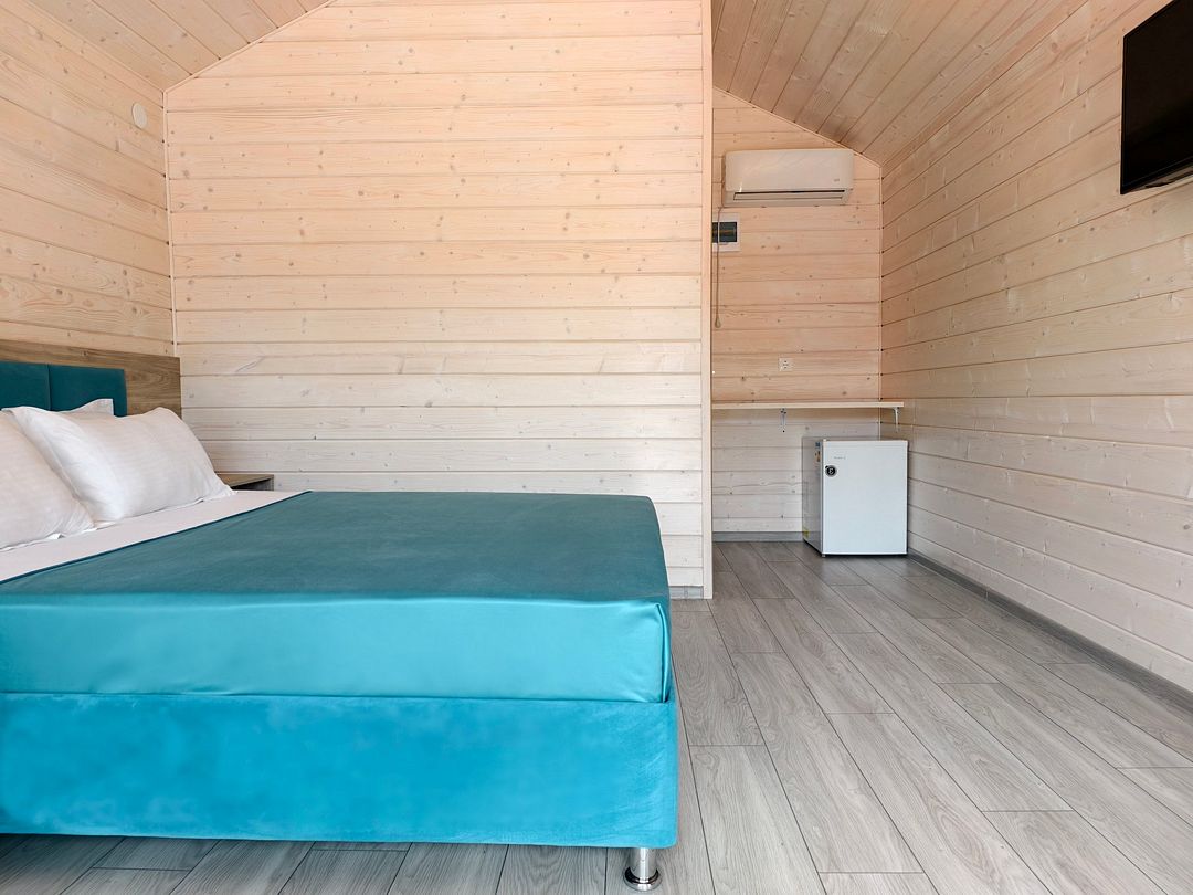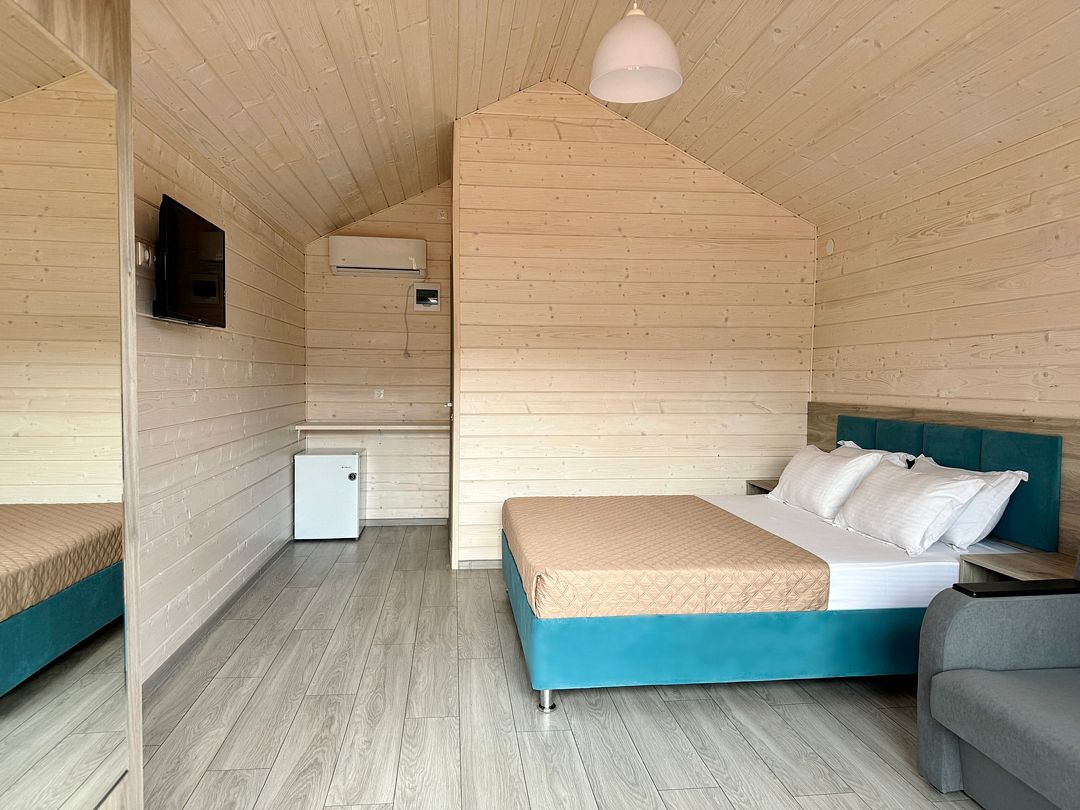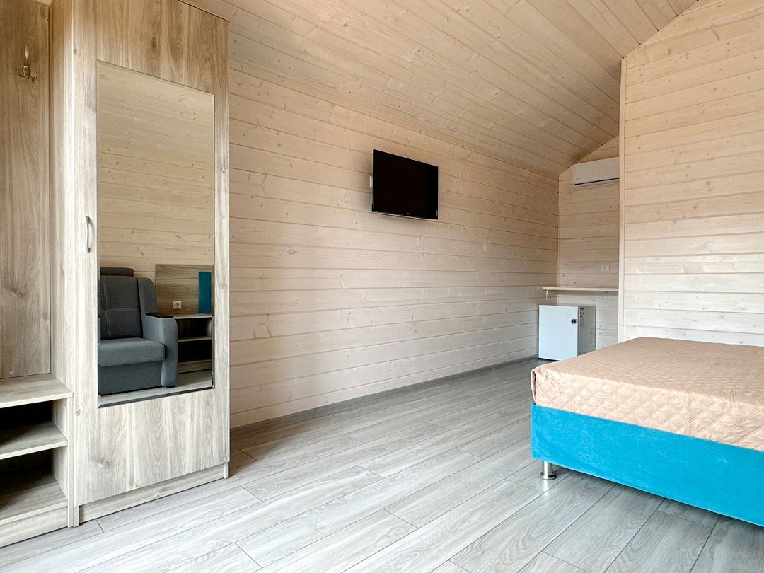 Домик оснащен: двуспальная кровать, прикроватные тумбочки, шкаф, зеркало, вешалка, мини-холодильник, телевизор, сплит-система.