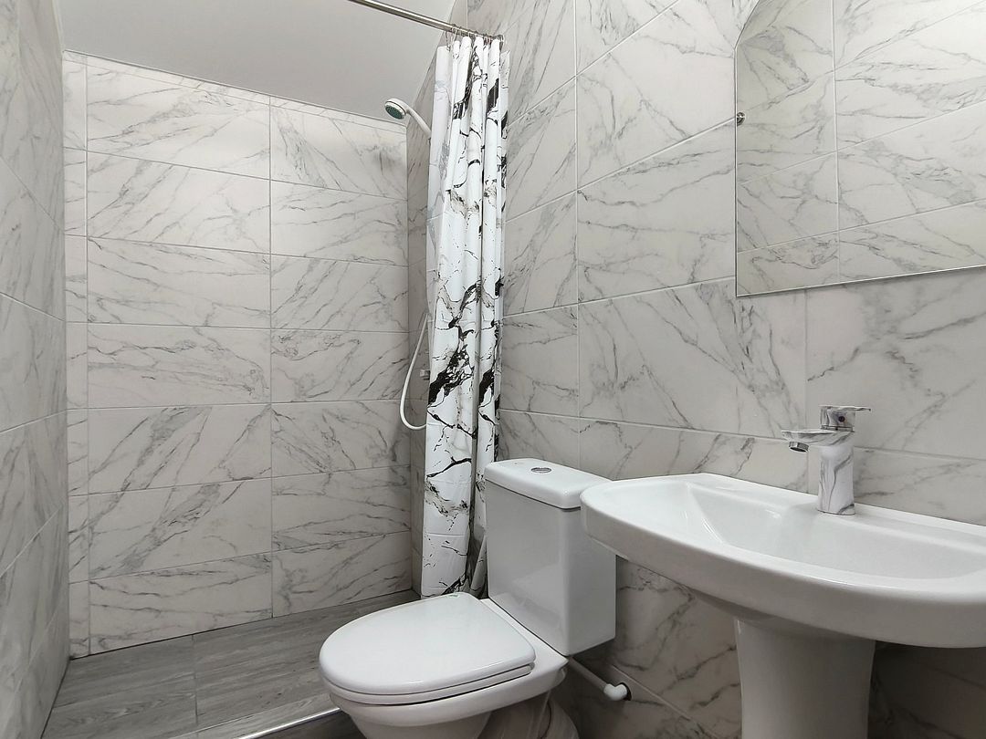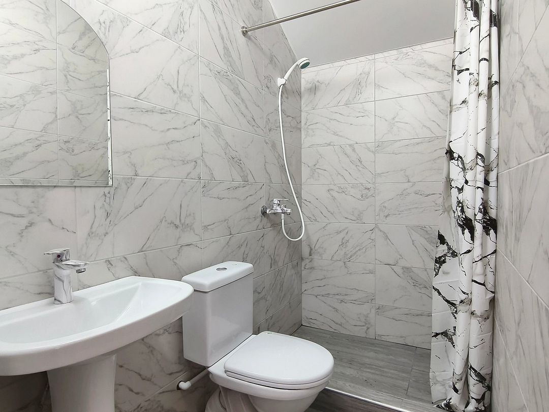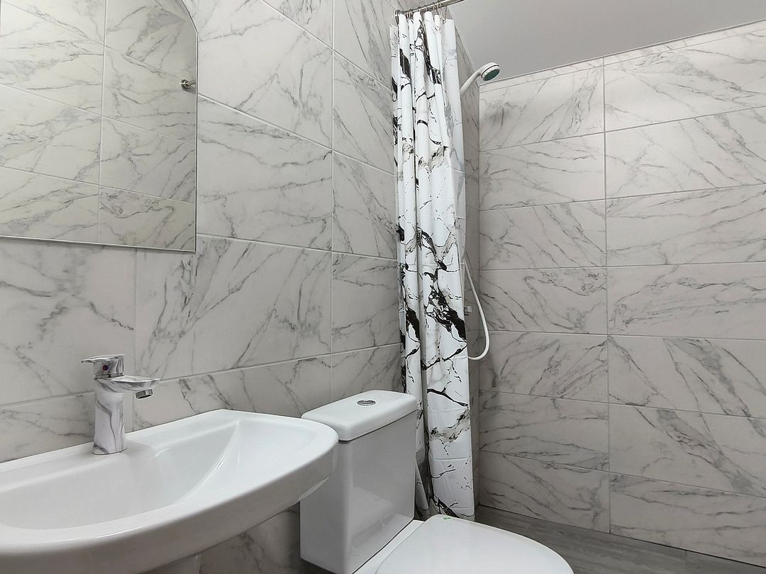 Ванная комната: душ, раковина, зеркало, туалет.