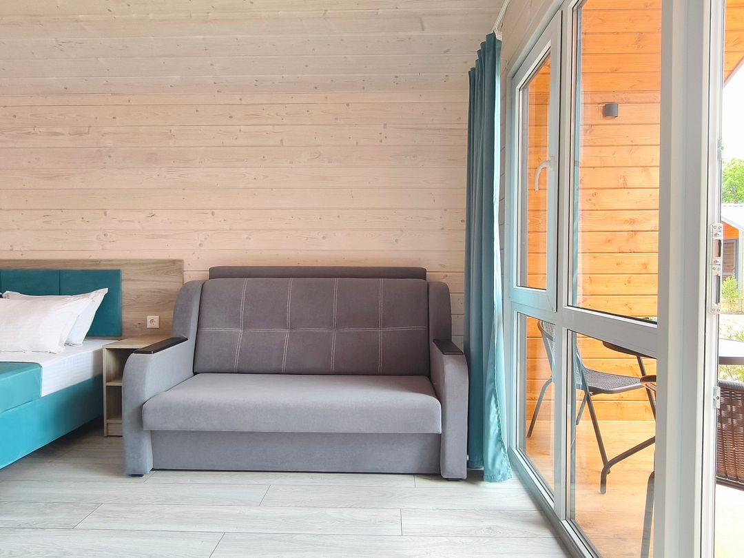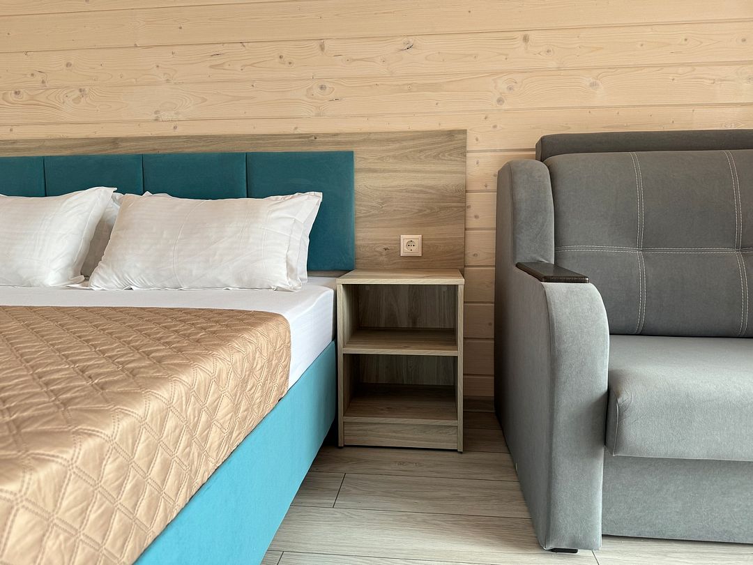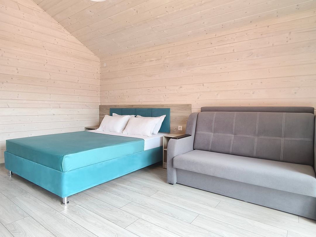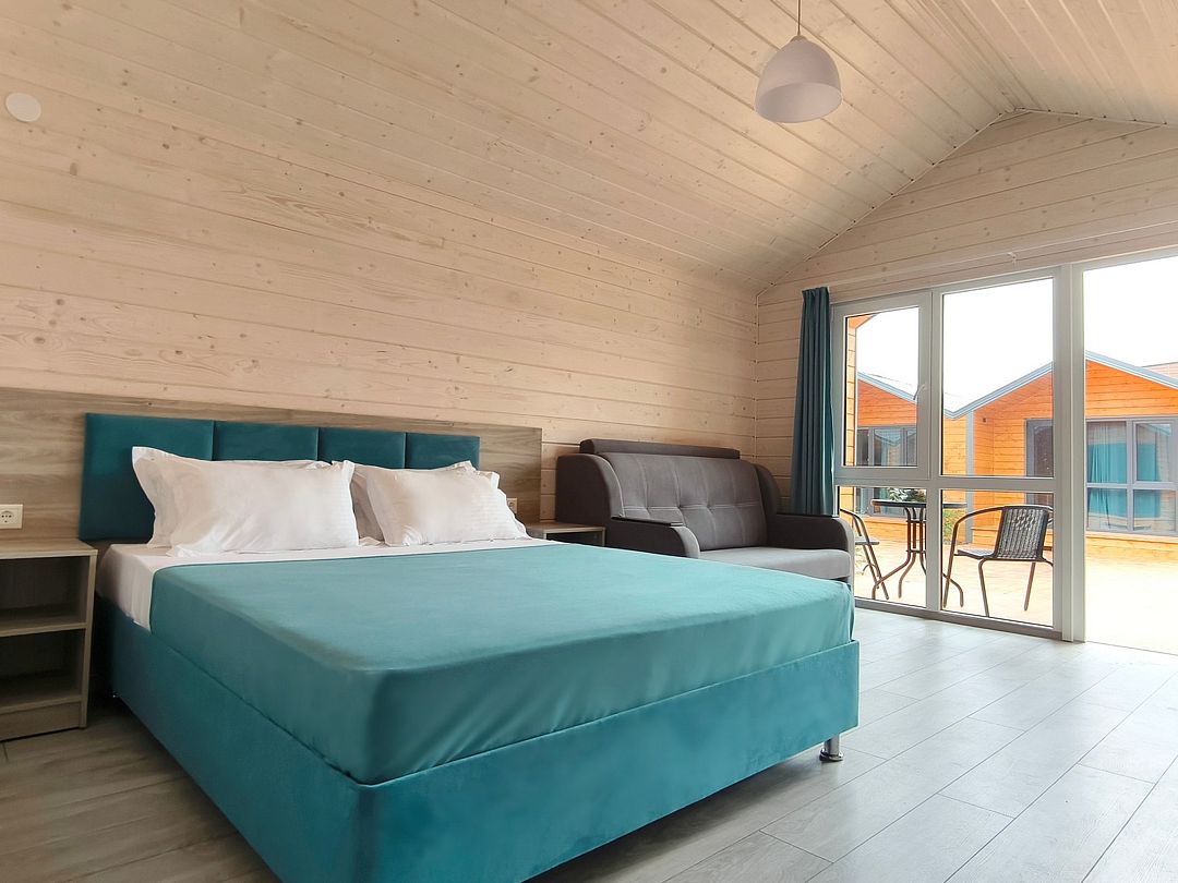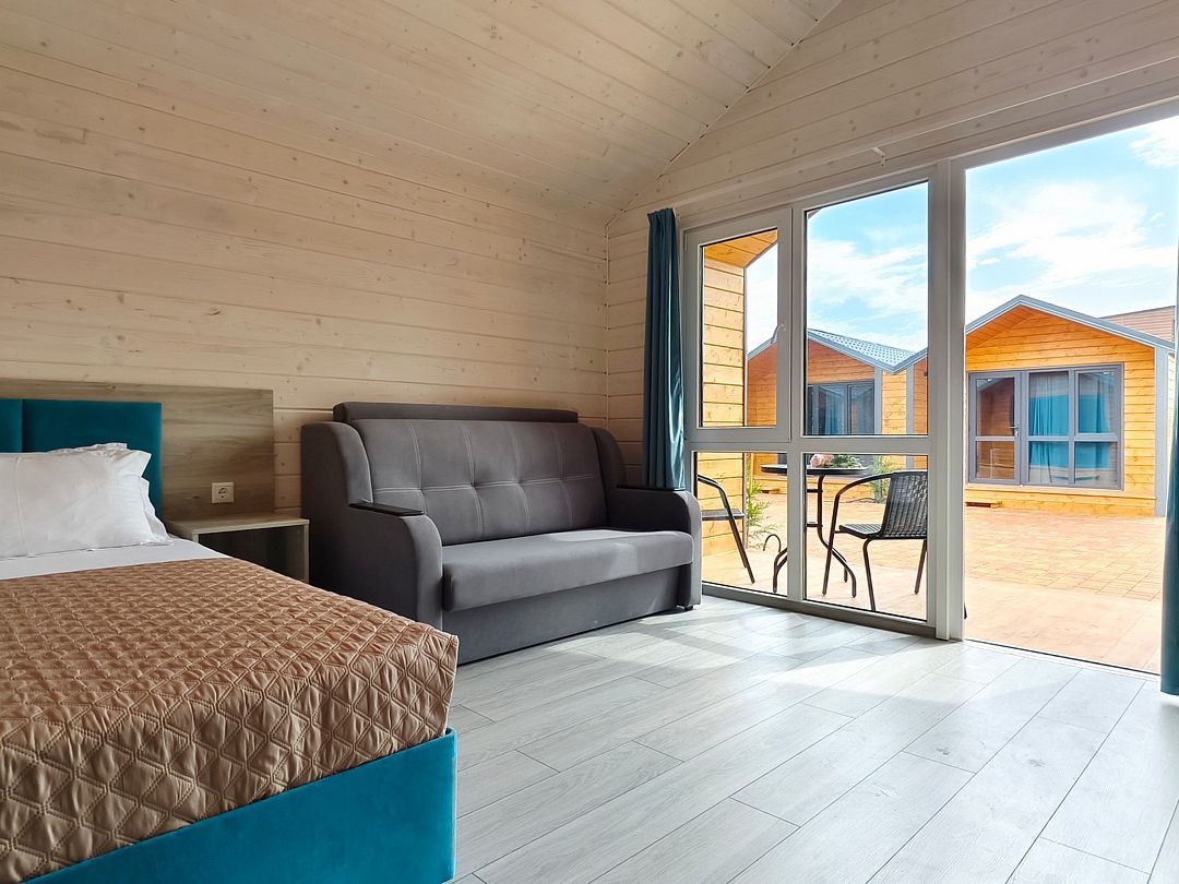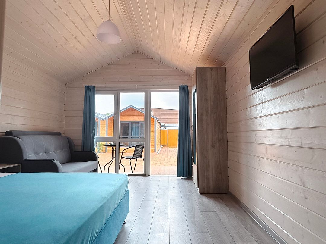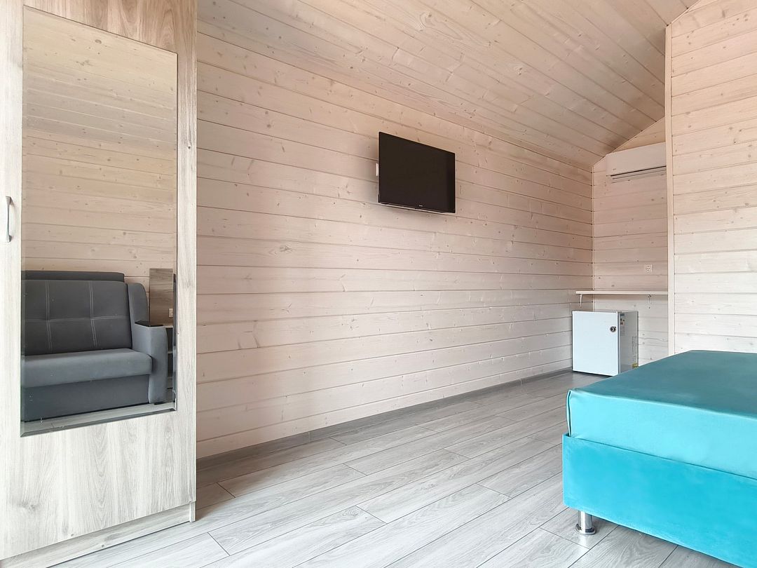 Домик оснащен: двуспальная кровать, односпальный диван, прикроватные тумбочки, шкаф, зеркало, вешалка, мини-холодильник, телевизор, сплит-система.