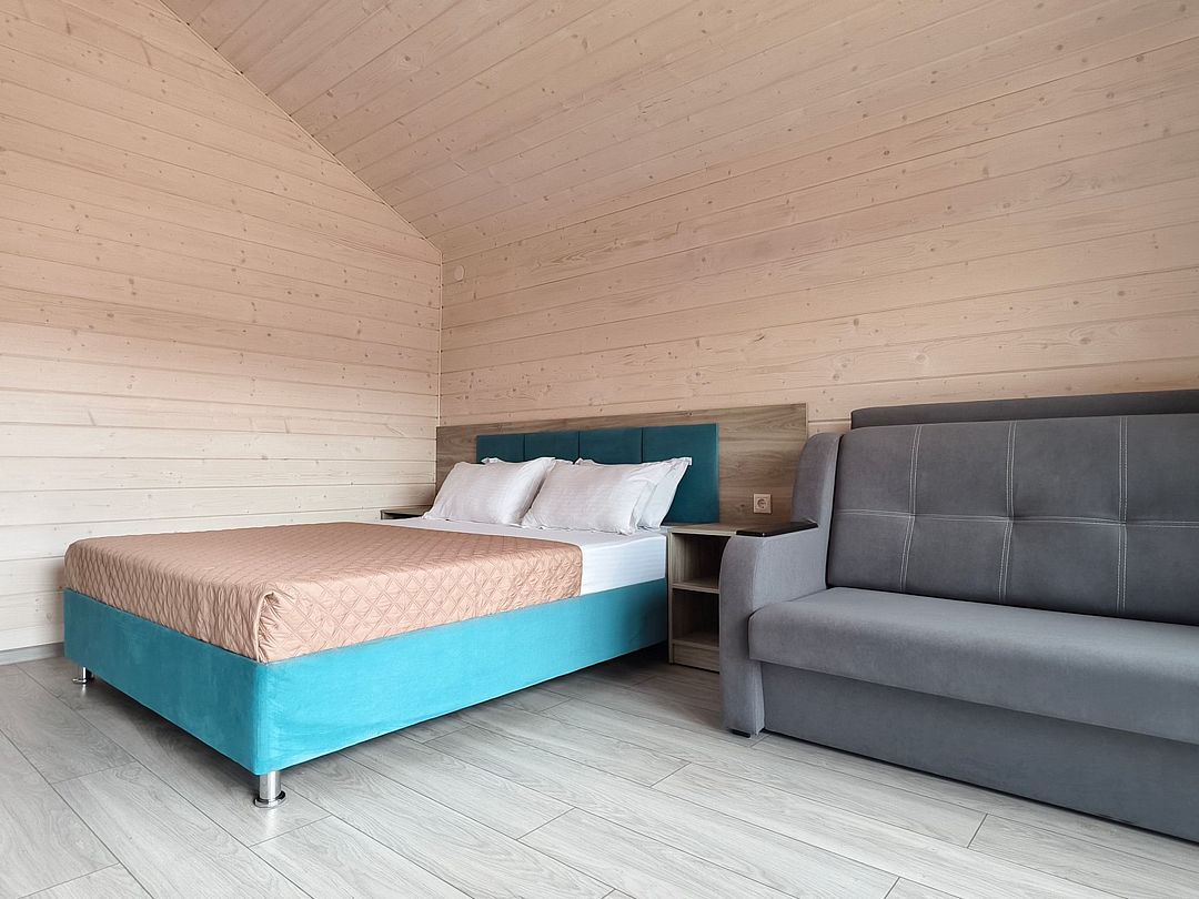 Одна двуспальная кровать, одна диван-кроватьВ домике