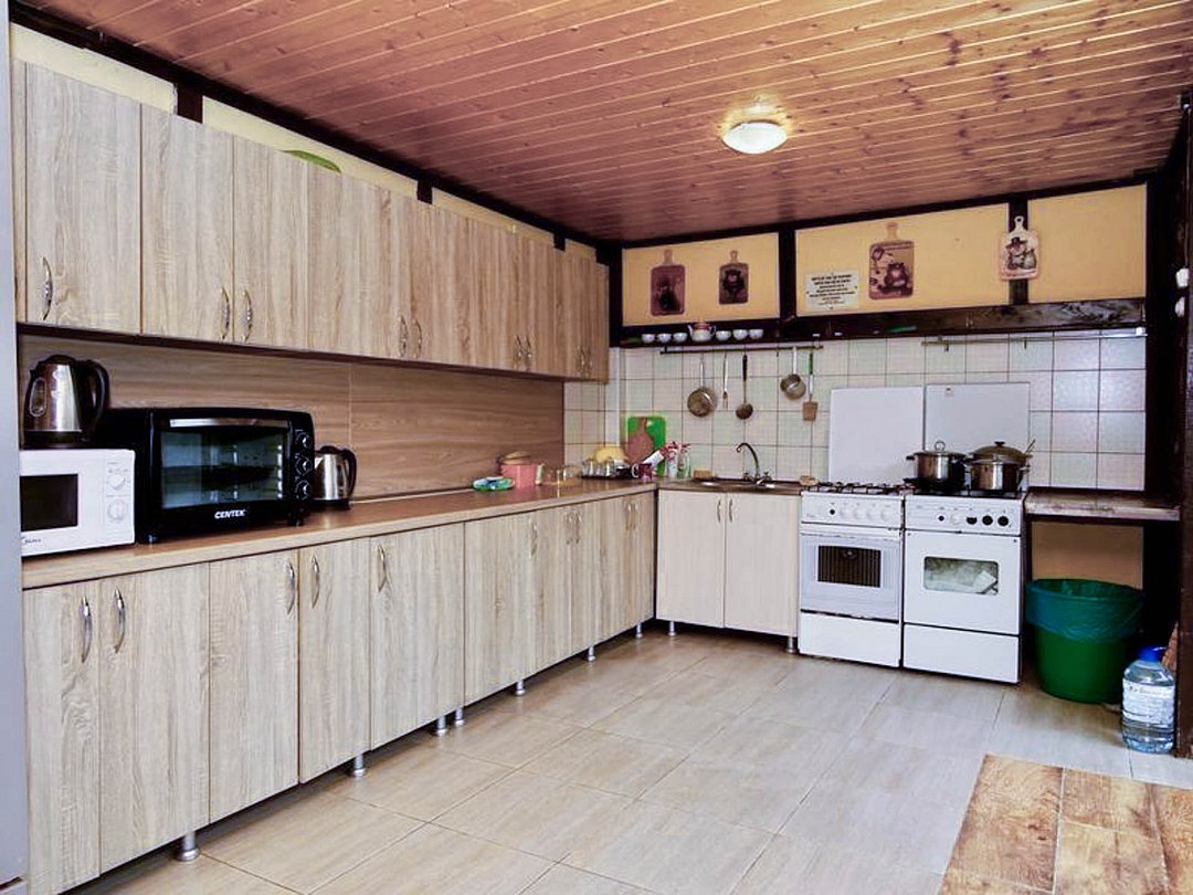 Гости могут воспользоваться общей кухней, которая оснащена всем необходимым для самостоятельного приготовления пищи. Здесь есть газовые плиты, микроволновая печь, мультиварка, холодильник, а также полный набор посуды.