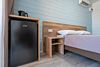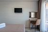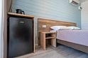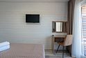 ТВ с плоским экраном, шкаф, две тумбочки, зеркало, чайник, холодильник, кондиционер. Санузел: душ, раковина, унитаз, полотенца, туалетные принадлежности. Общая площадь номера 20 м².