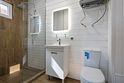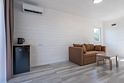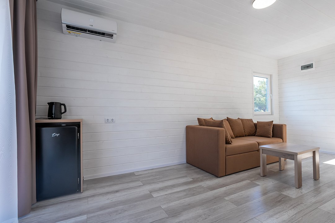 Двухкомнатный четырехместный домик, ТВ с плоским экраном, шкаф, две тумбочки, зеркало, журнальный столик, чайник, холодильник, кондиционер. Санузел: душ, раковина, унитаз, полотенца, туалетные принадлежности. На веранде столик со стульями.