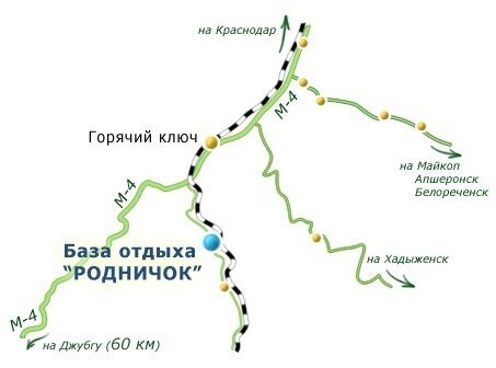 Если вы следуете со стороны Краснодара по трассе «Дон» М-4, то в районе г. Горячий Ключ ориентиром может послужить ресторанный комплекс «Старый Замок», расположившийся прямо на трассе. Проехав его, после закрытого, слегка затяжного поворота пора приготовиться и внимательно следить за указателями на дороге (нужны указатели влево на село Безымянное или Фанагорийское). Прямо за нужным поворотом располагается часовня Святого Николая, хотя этот ориентир более удобен для отдыхающих, едущих со стороны побережья. В любом случае, когда поворот будет найден, всё самое сложное останется позади. Примерно через 15 минут езды по левую сторону от дороги покажется крупная жёлтая табличка с алыми буквами «База отдыха "Родничок"».